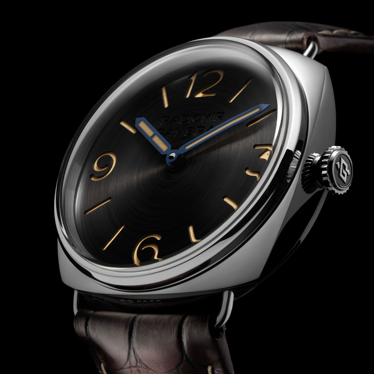 Quick facts: 47mm diameter – polished Panerai Platinumtech case and bezel – domed PLEXIGLAS crystal – Platinumtech exhibition caseback with sapphire crystal – wire lugs – water-resistant to 100m – black circular-brushed sandwich dial – beige Super-LumiNova – tone-on-tone engraved “Radiomir Panerai” inscription – blue burnished steel hands – Panerai calibre P.3001/10 – hand-wound – skeletonised bridges – 21 jewels – 21,600vph – twin barrels – 3-day power reserve – hours, minutes, power reserve indicator on the back