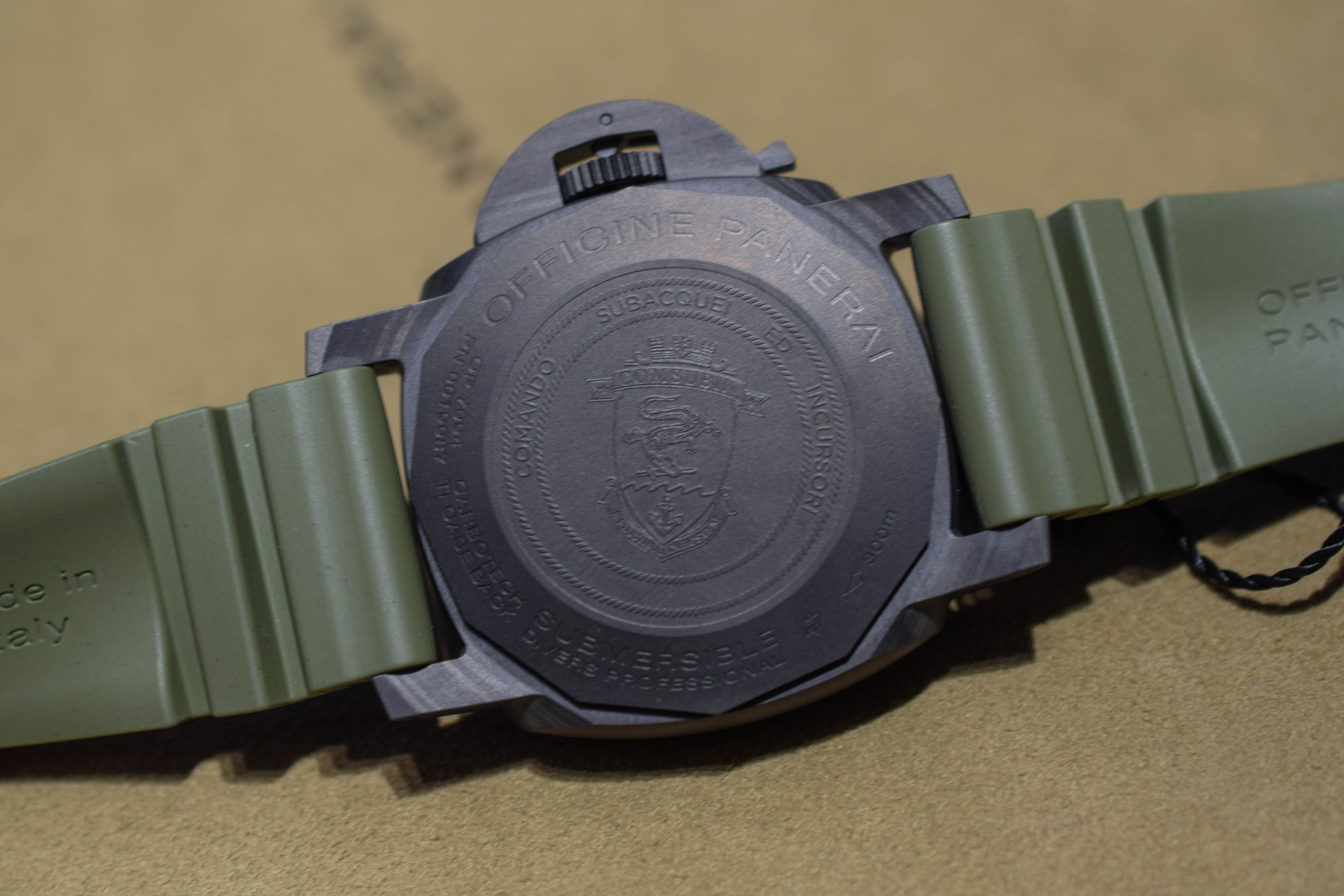 Now on to the important things to know about this PAM00961. Panerai wants to focus on two things with its upcoming watches. First, exclusivity. As a result, this watch is a limited edition of only 33 pieces reducing the chances that your neighbour has the same model. Then, experience. This watch has actually been created with Comsubin, the Diving and Commando Group of the Italian Navy – and its logo can be seen on the back. But that’s not all.