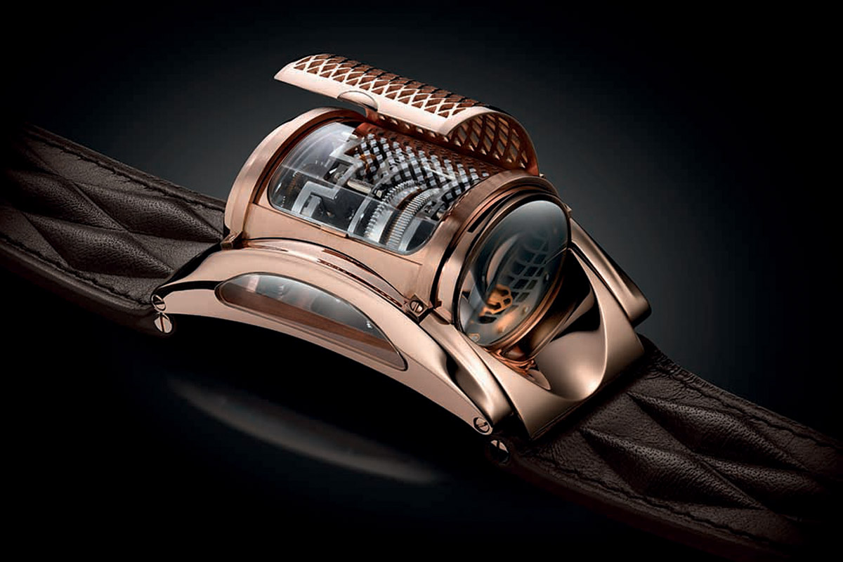 The Bugatti Type 370 Révélation is styled on the motifs of the Molsheim-built racers of the previous century. The rose gold body uses the lug-to-lug arches astride either side of the case to mimic a leaf-spring suspension while filigreed ‘Grille’ opens and closes over the top of the vertical movement to proudly display the engine beating beneath.