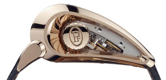 Yes, this Parmigiani Fleurier Bugatti Type 390 does tell the time via classical hands, normally rotating once per hour or once every 12 hours. However, that’s the only thing that is classical here. The conception of the watch is specific. As you can see, there are two parts in this shaped movement. The long and flat area is only dedicated to the display of time – meaning that it only serves the hands. All the rest of the watch is located in a cylinder – somehow using a architecture close to the barrel-like Parmigiani Fleurier Bugatti Type 370, with the idea to depict a engine in mind.