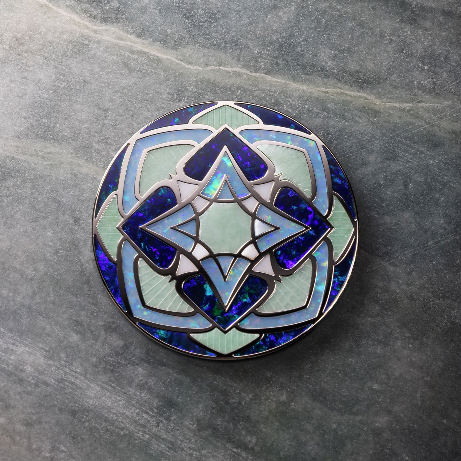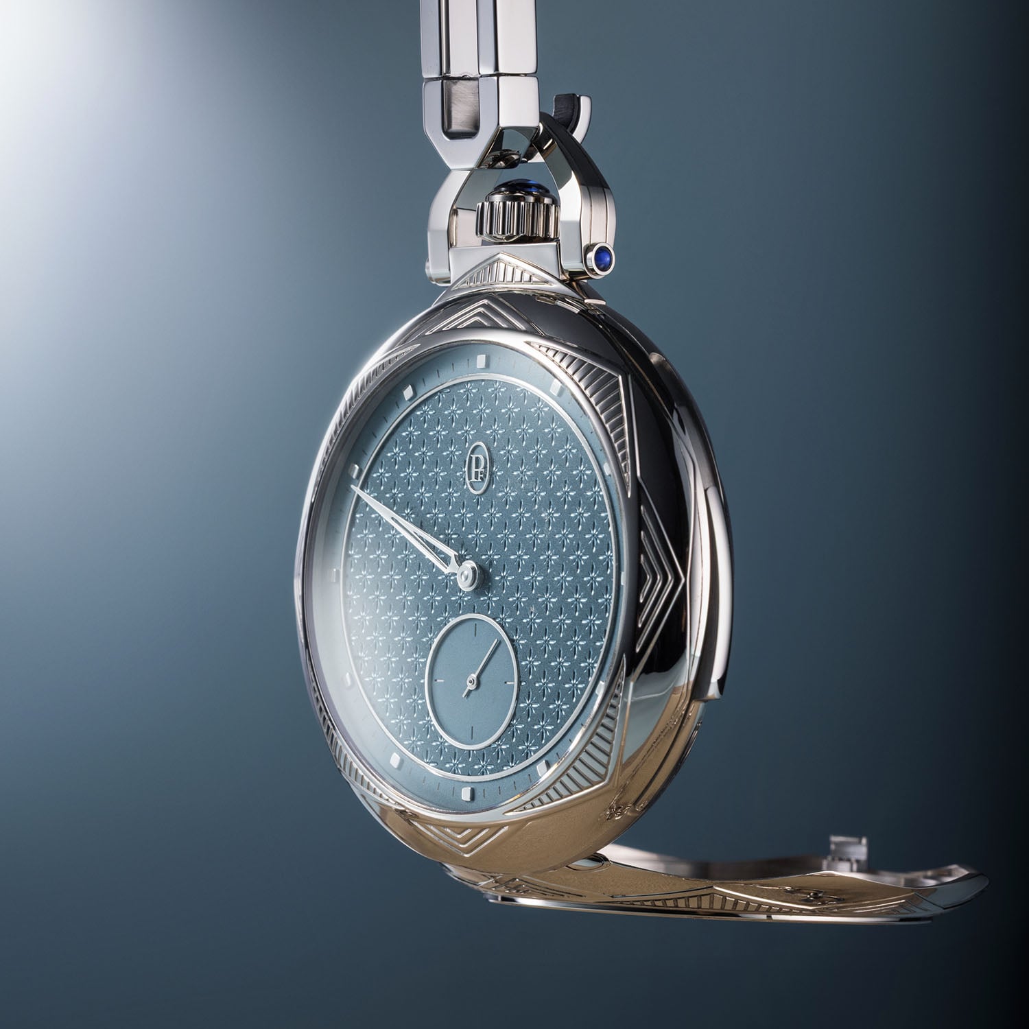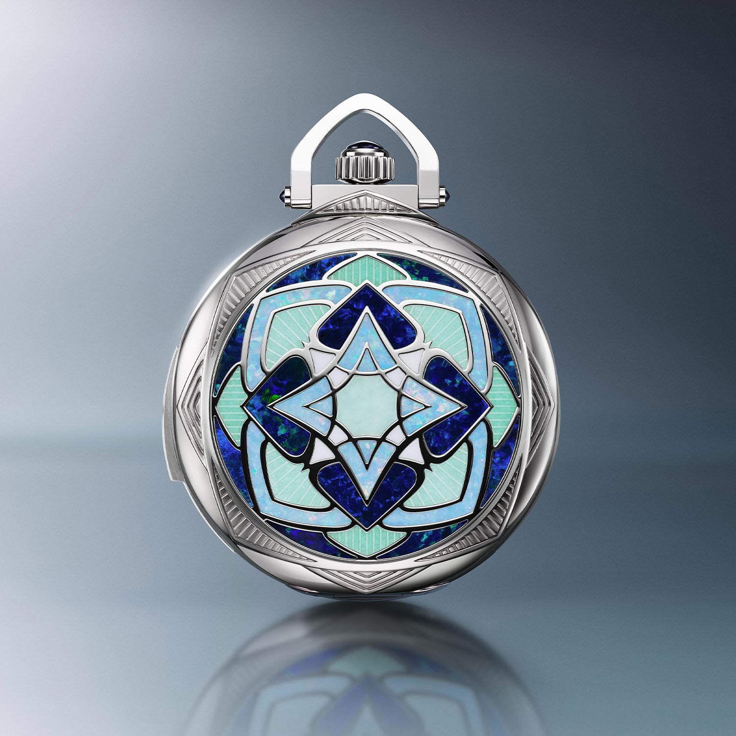 The 51.8mm white gold case has a hinged caseback engraved with a series of overlapping, symmetrical patterns inspired by the Madagascar palm, and embellished with iridescent opal and light green jade marquetry. True to its 1920s repeater movement, the white gold case with its alternating geometric engravings has a sophisticated Art Deco air. The crown at noon and the extremities of the bridge attaching the pocket watch to the chain are set with blue sapphires.