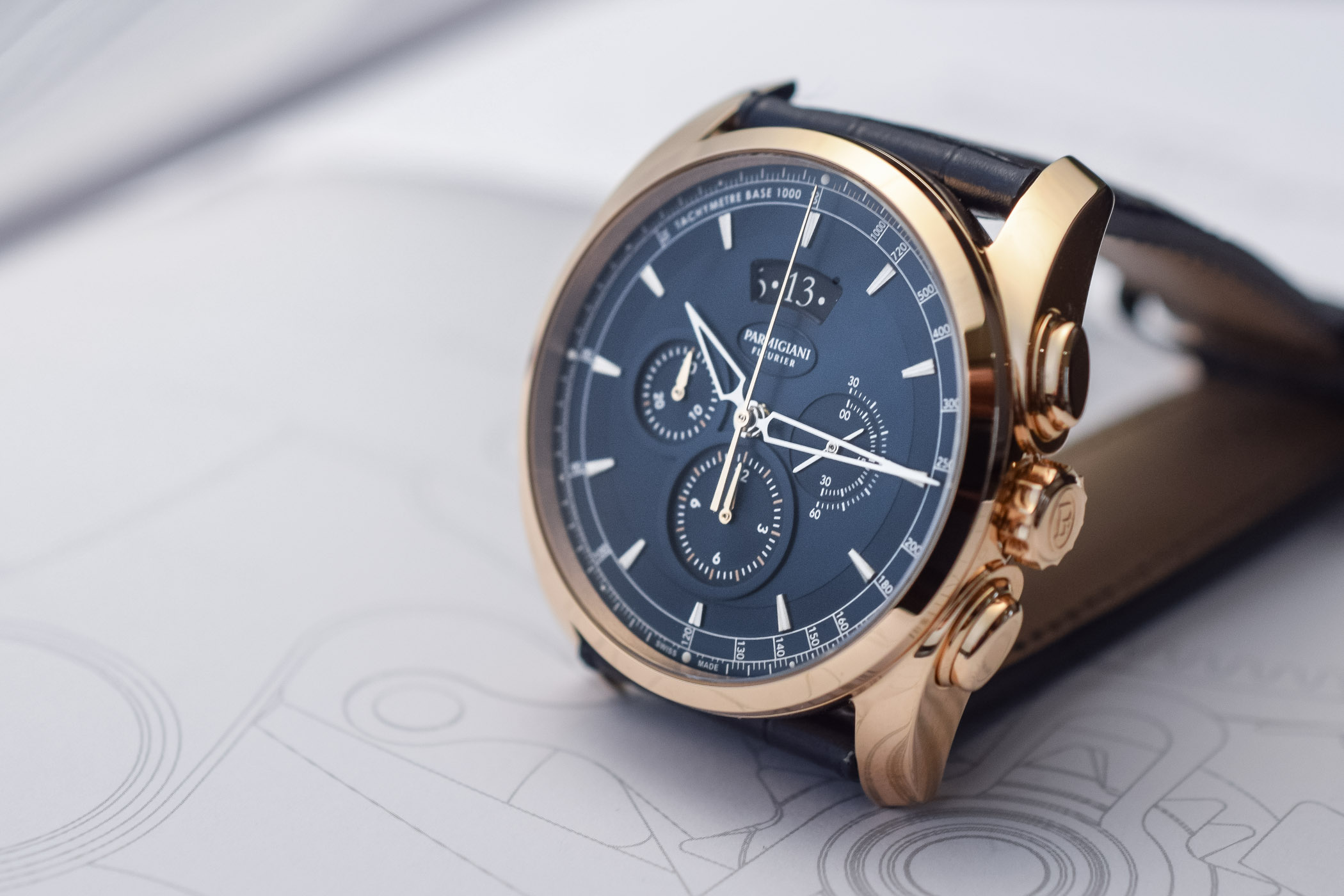 Featuring a blue-opaline finish, the nicely crafted three-register dial is in the same vein as the models introduced at SIHH 2017. The chronograph sub-counters feature a flinqué pattern and form a figure eight (a signature Parmigiani design) delimited by raised sectors. The double-sided small seconds hand at 3 o’clock is a nice touch. The short facetted rhodium-plated hour markers are paired with openworked hours and minutes hands. The large date aperture displays odd numbers only and is located at 12 o’clock, on top of the brand’s oval logo. A snailed pattern at the periphery of the dial adds to the overall sense of depth while the tachymeter scale underscores the sporty yet elegant touch.