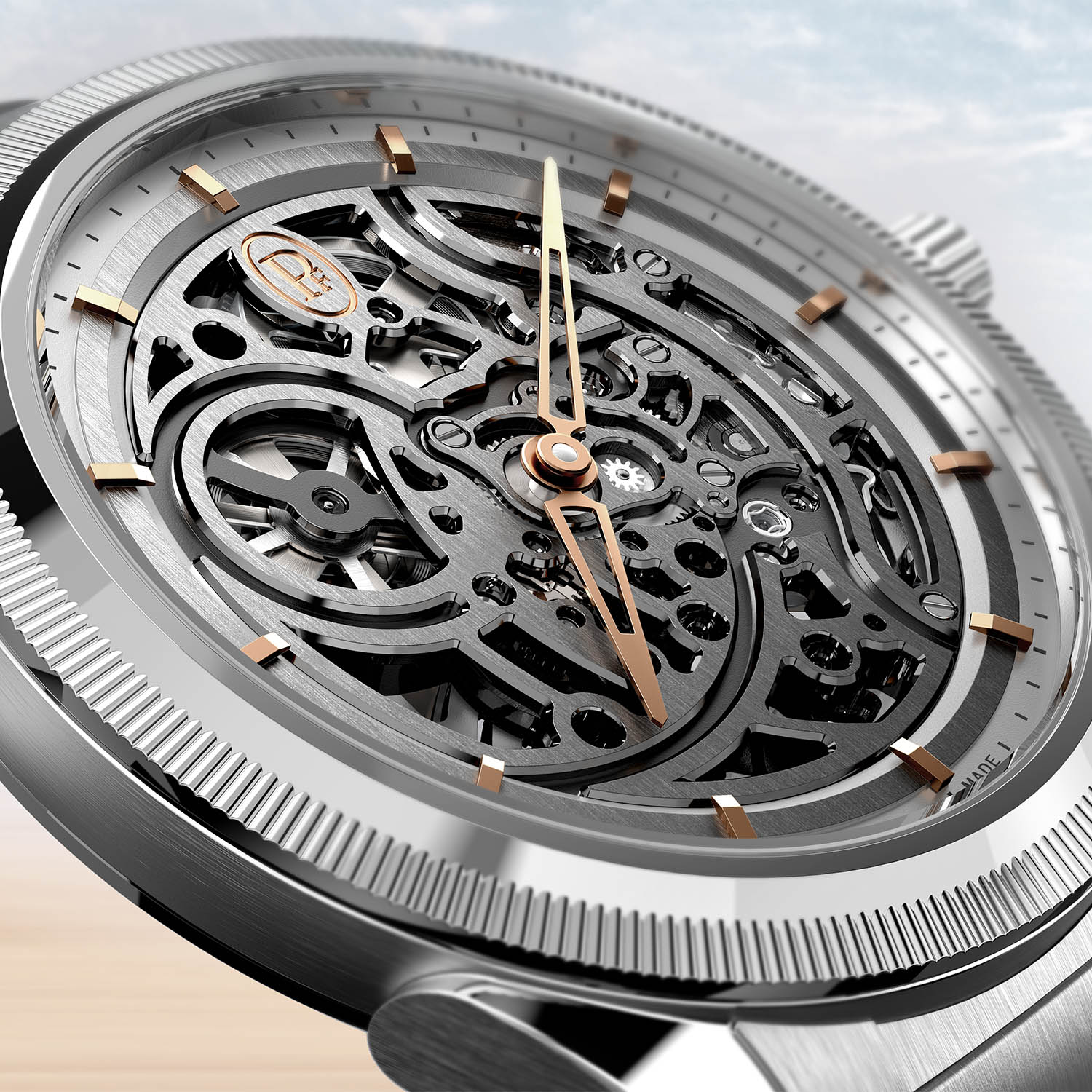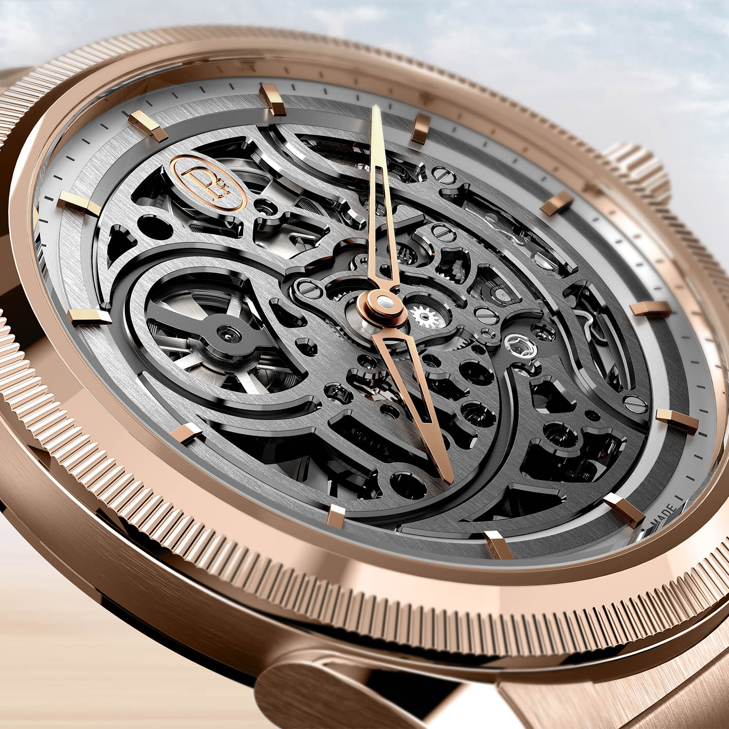 In keeping with the signature design codes of the Tonda PF collection, the 40mm case has a slim silhouette of 8.5mm and displays contrasting polished and satin-finished finishings that follow through to the integrated bracelet. The hallmark knurled and polished bezel that distinguishes the collection is made of rose gold for the gold model and platinum for the steel model. As Parmigiani’s luxury sports watch representative, the Tonda PF Skeleton models live up to their name with screw-down crowns and 100m water-resistant cases.