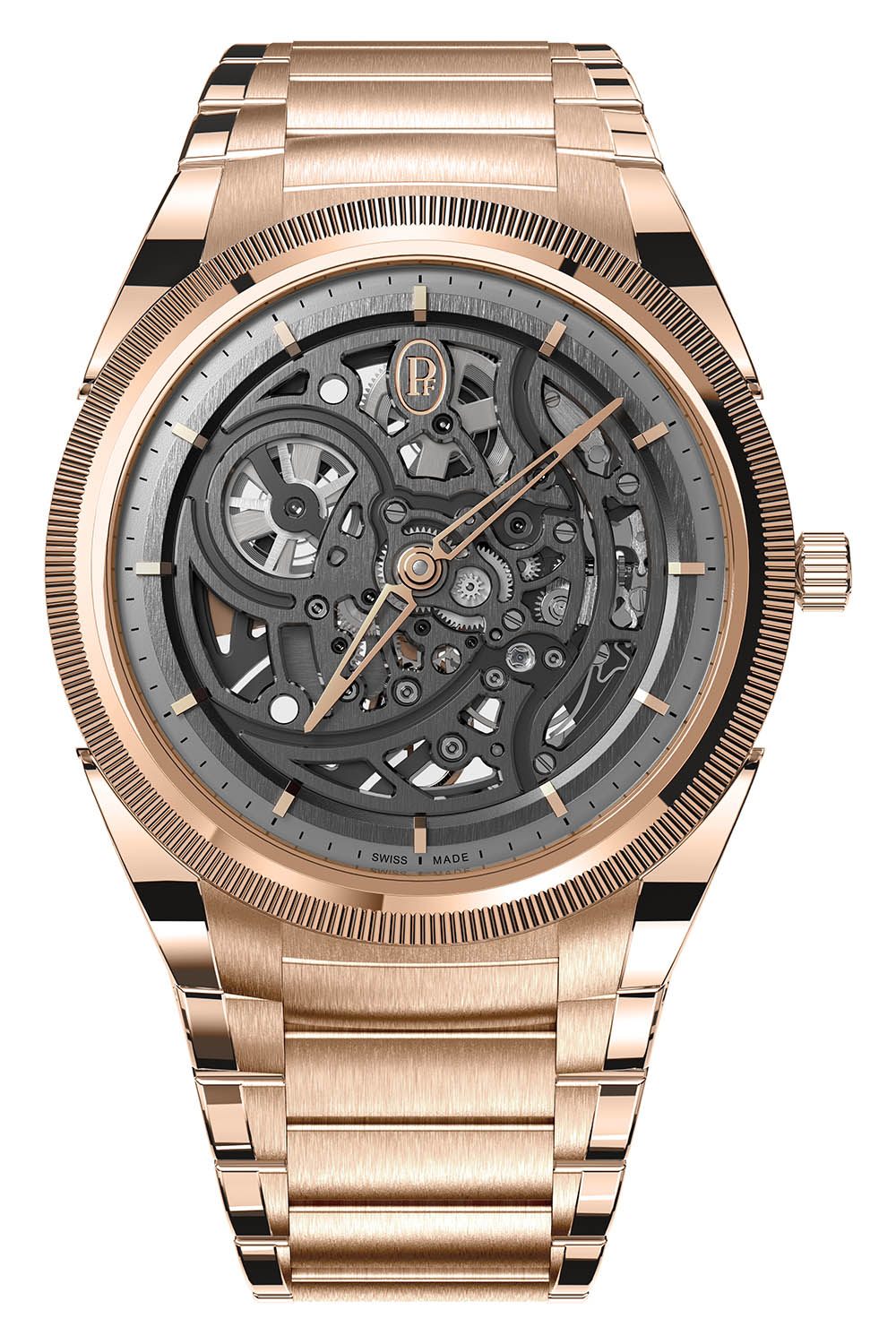 Using graceful curves with openworked areas on both sides of the Tonda PF Skeleton, the graphite-coloured bridges are decorated with alternating sandblasted and satin finishings and reveal their impeccable hand-chamfered edges. The elegant curving compositions that shield the movement are, as we mentioned, attractive in their own right and complement the streamlined case and bracelet of the Tonda PF collection. Like all other models in the family, the gold delta-shaped hands are skeletonised, as are the hand-applied rose gold indices that rest on the peripheral chapter ring.