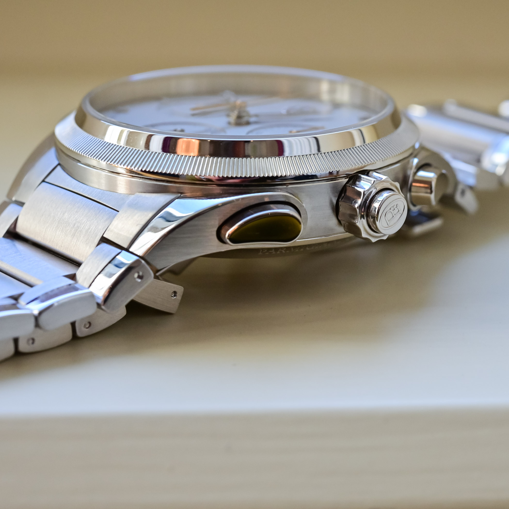 As mentioned earlier, the byword for the collection is understatement, and the dial does the word justice. It might not have the bold luminous displays or contrasting colours we associate with sporty chronographs, but it has a calming, almost regal refinement. Like the case and bracelet, the dial is made of sandblasted platinum to achieve a matte, finely granulated texture. A peripheral pulsometer scale calibrated to 30 heartbeats (or pulsations) is printed in black and hosts twelve small hand-applied rhodium-plated hour markers. The three sub-dials – 30-minutes at 3, running seconds at 6, and 12-hour counter at 9 o’clock – are slightly recessed with simple black markings and Arabic numerals.