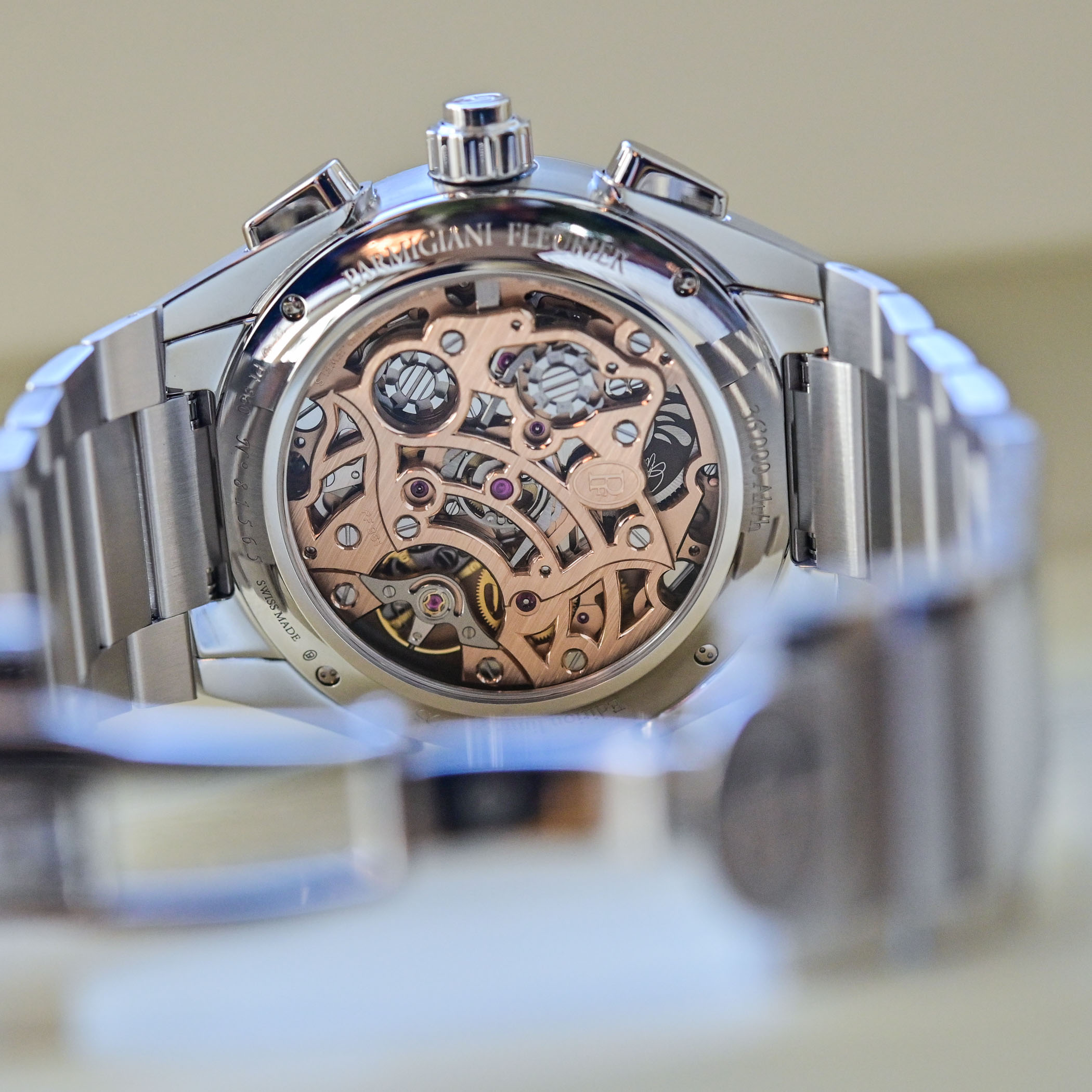 The case has a diameter of 42mm and a height of 15mm, and displays contrasting hand-brushed and hand-polished finishings and the hallmark hand-knurled bezel of many Tonda and Toric watches. You can appreciate how the pushers, crown, lugs and external part of the bracelet feature a bright gleaming polish while the internal links of the bracelet and the casebands are satin-finished. Another hallmark trait of Parmigiani Fleurier watches is the teardrop-shaped pushers to start/stop and reset the chronograph. The third pusher in the crown is to activate the split-seconds function. The crown is screwed-in, and even with sapphire crystal front and back, the water-resistance of the case is a solid 100 metres. As Terreni illustrates in the video, the streamlined platinum bracelet is exceptionally flexible thanks to its ergonomic design and follows the contours of the wrist perfectly. The folding clasp is made of white gold.