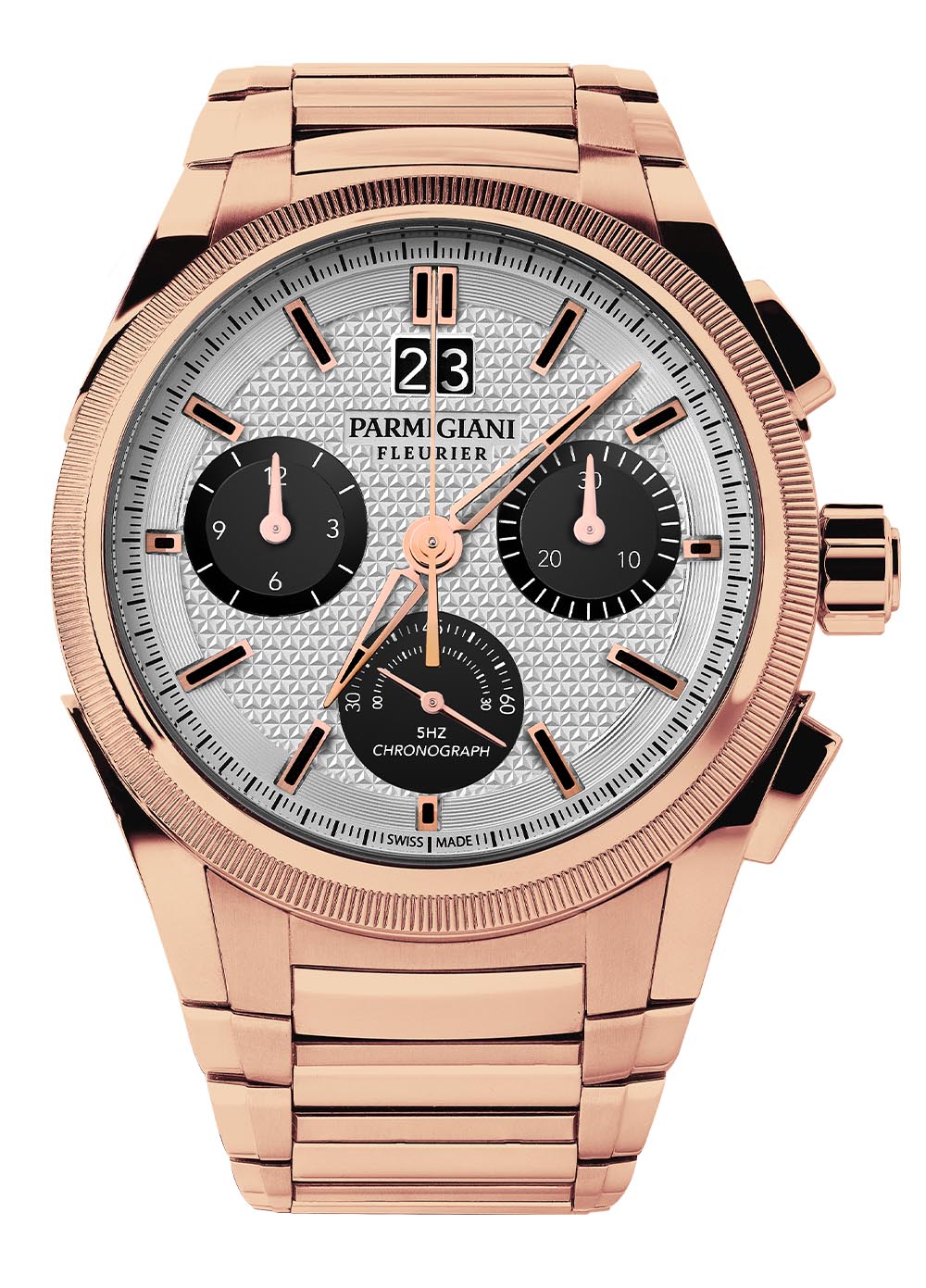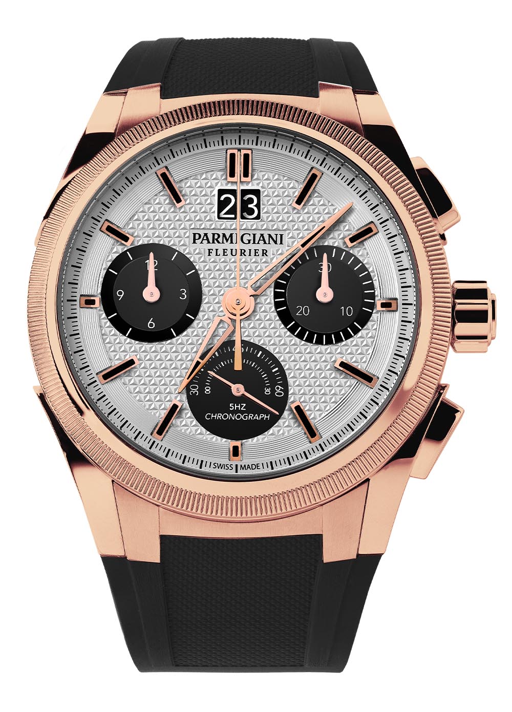 Sporty silver and black panda dials for Parmigiani’s Tondagraph GT steel annual calendar and chronograph and its rose gold model with a high-end, COSC-certified 5Hz integrated chronograph movement.