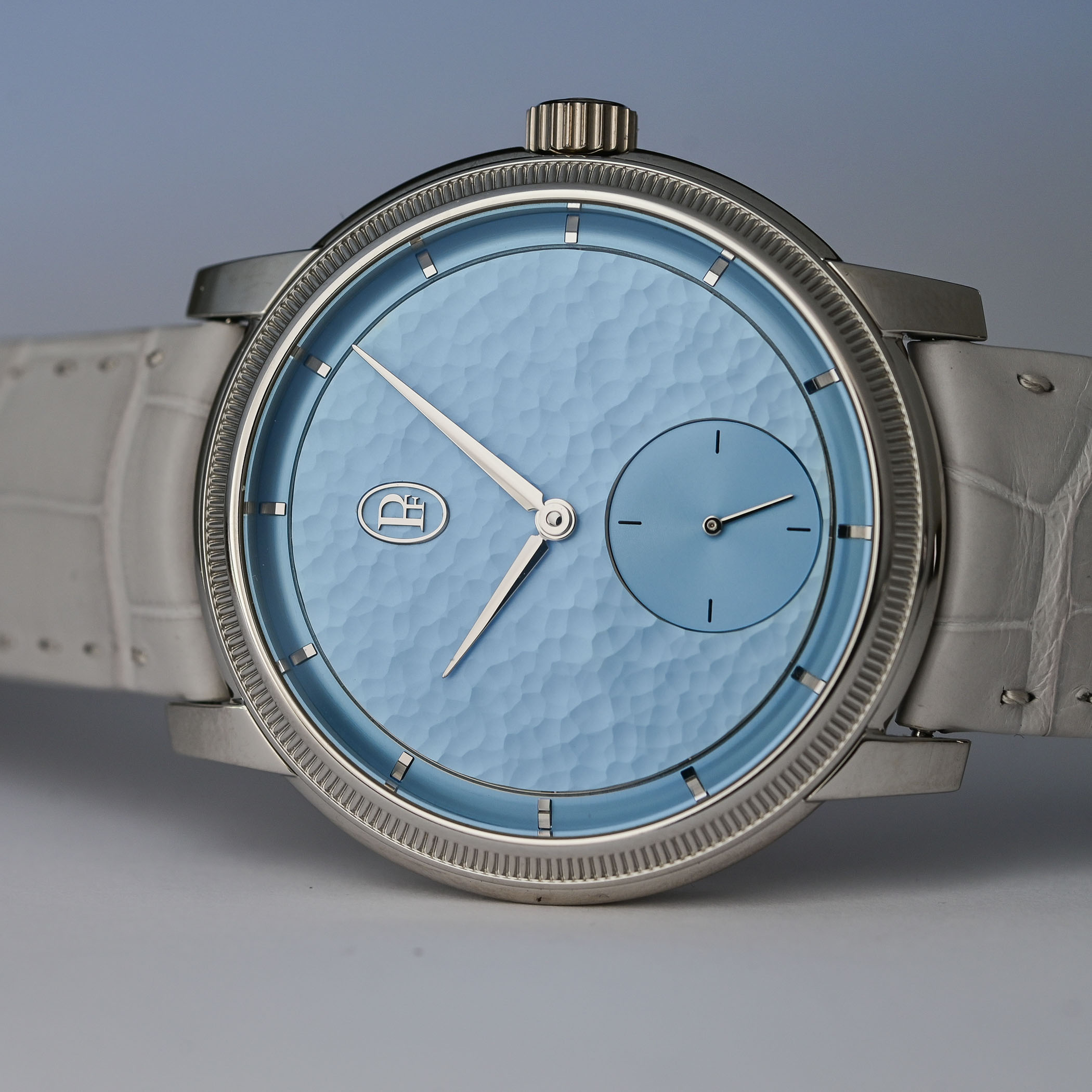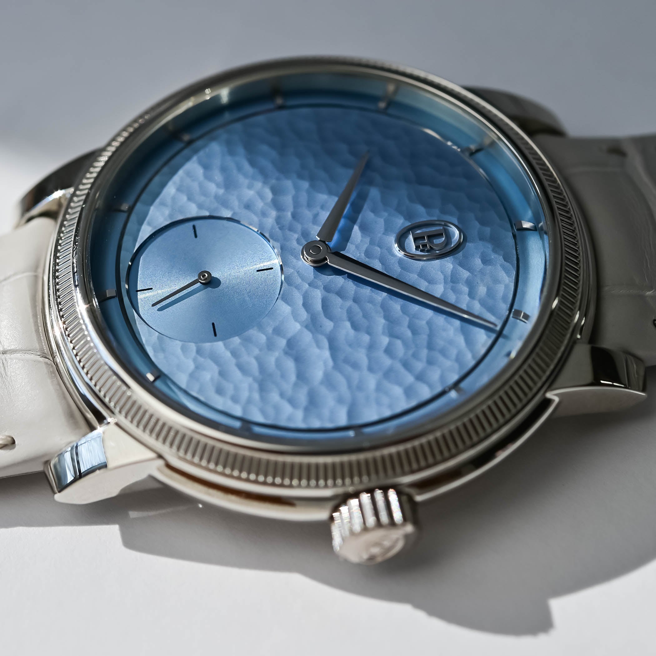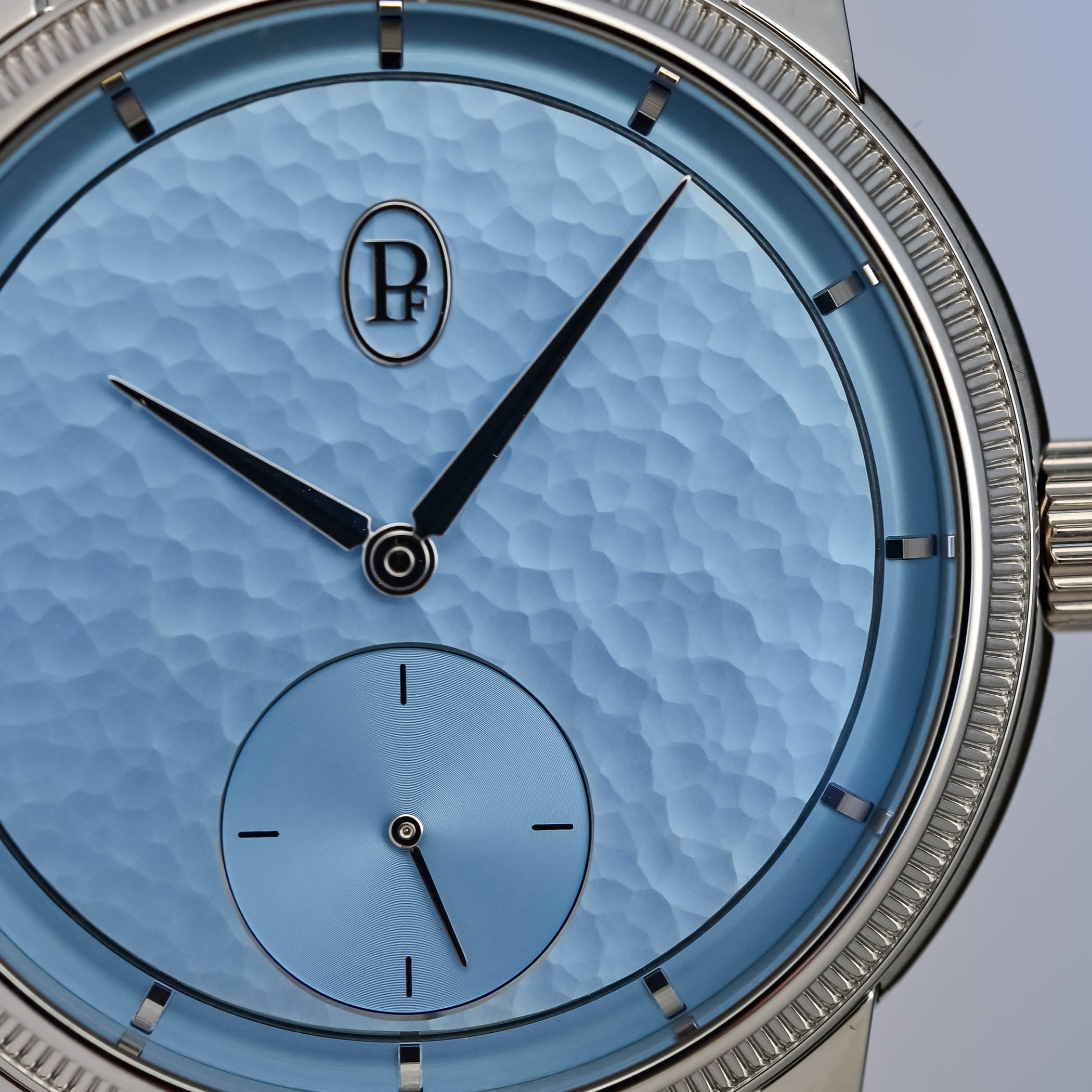 Aptly named Morning Blue, the soft light-blue hand-hammered gold dial works beautifully with the gleaming, polished surfaces of the platinum case. A narrow chapter ring on the periphery houses the hand-applied gold indices, while the central area of the dial features the oval PF cartouche at noon counterbalanced by the recessed and finely snailed small seconds counter at 6 o’clock.