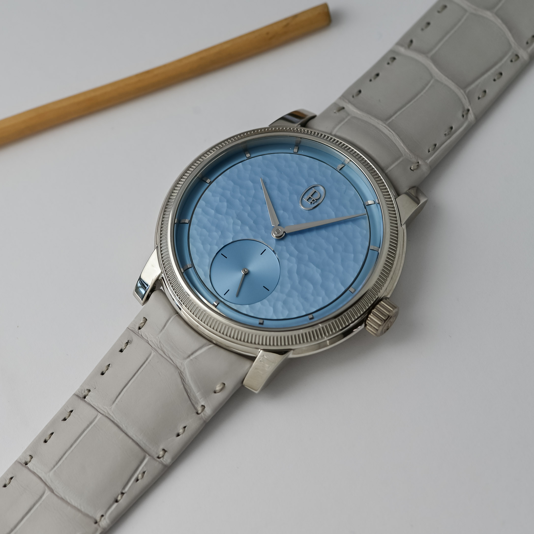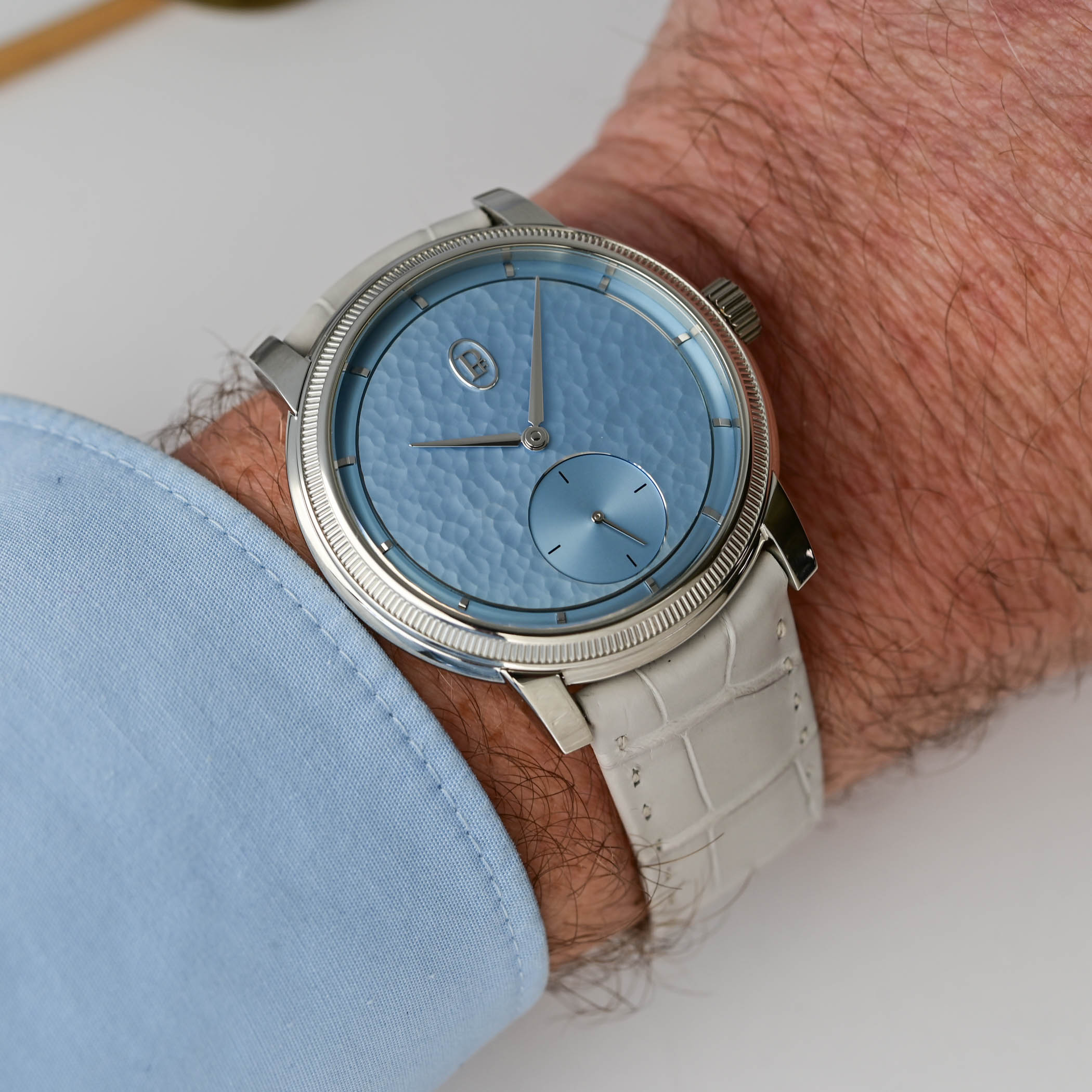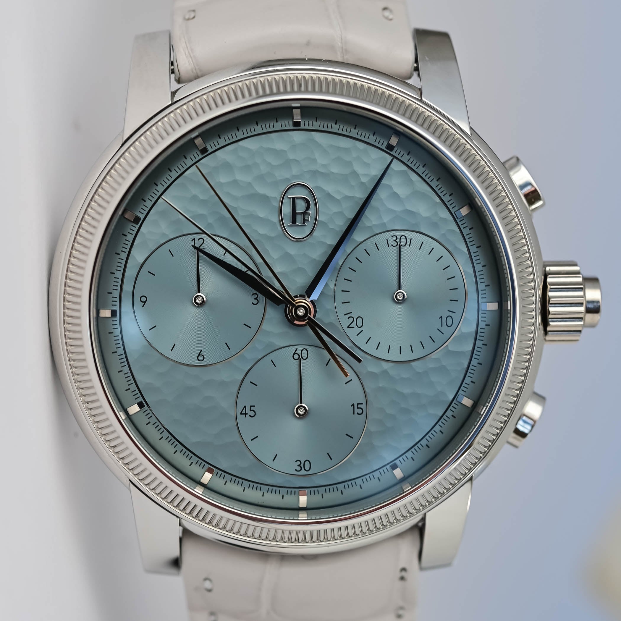 Aptly named Morning Blue, the soft light-blue hand-hammered gold dial works beautifully with the gleaming, polished surfaces of the platinum case. A narrow chapter ring on the periphery houses the hand-applied gold indices, while the central area of the dial features the oval PF cartouche at noon counterbalanced by the recessed and finely snailed small seconds counter at 6 o’clock.