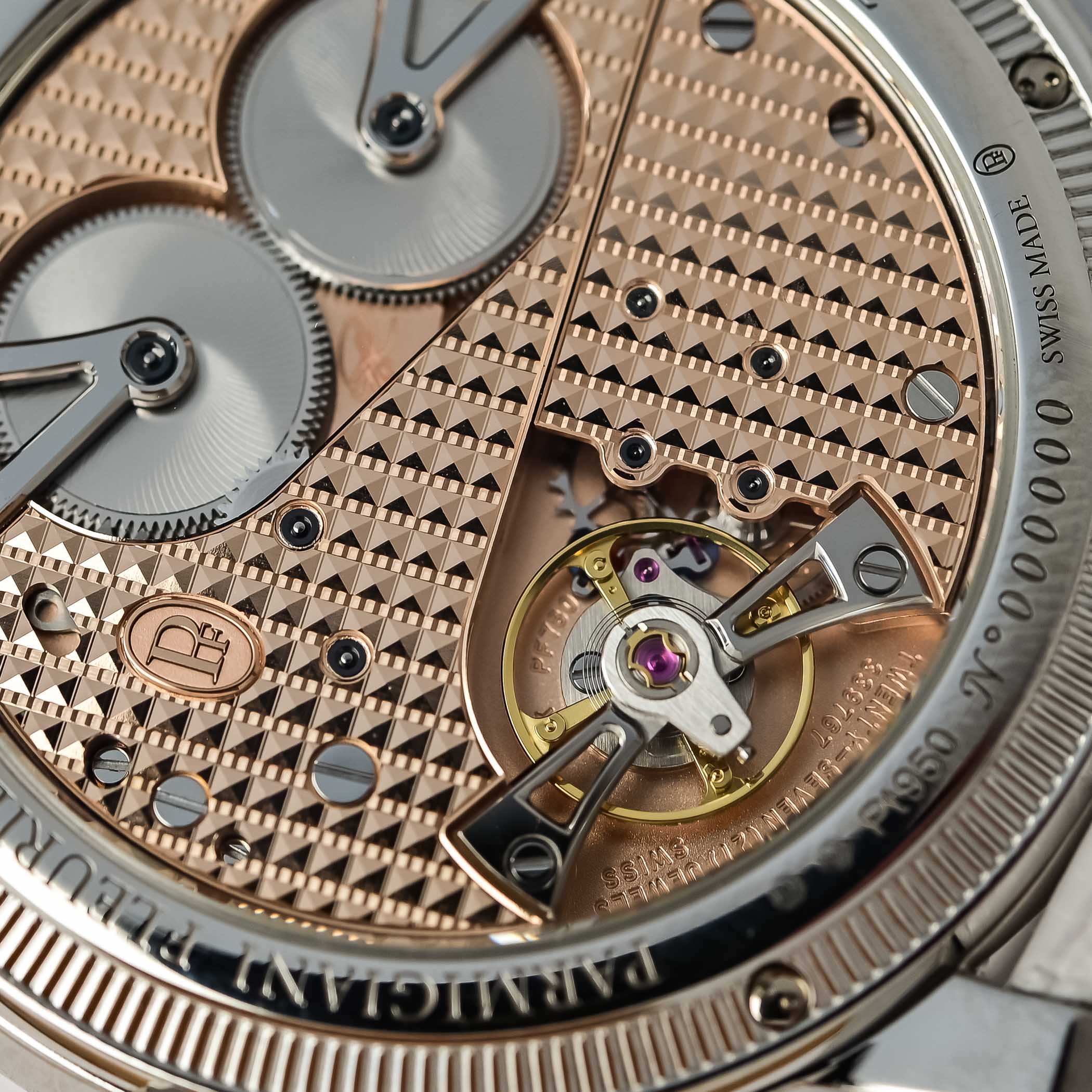 Matching the case, the Bright Peony rose gold dial, with its undulating hand-hammered surface, conveys warmth and luxury. The caseback reveals components of the calibre PF733, including the double barrels housing the 60-hour power reserve and the 4Hz regulating organ, surrounded by the magnificent rose gold bridges decorated by hand with Clou de Paris guilloché.