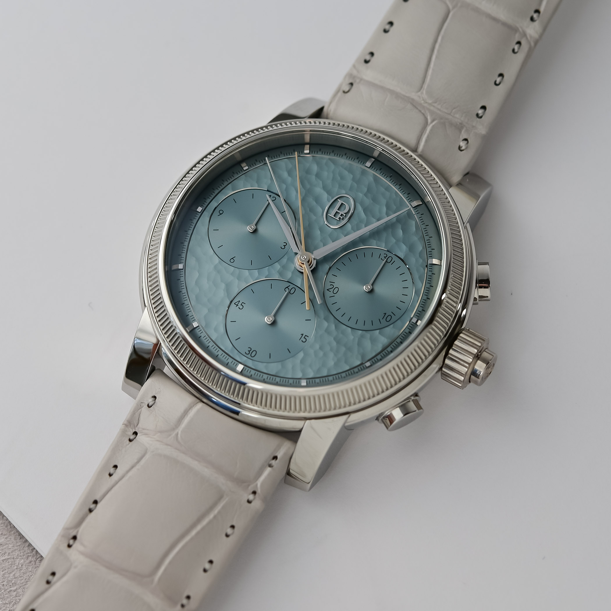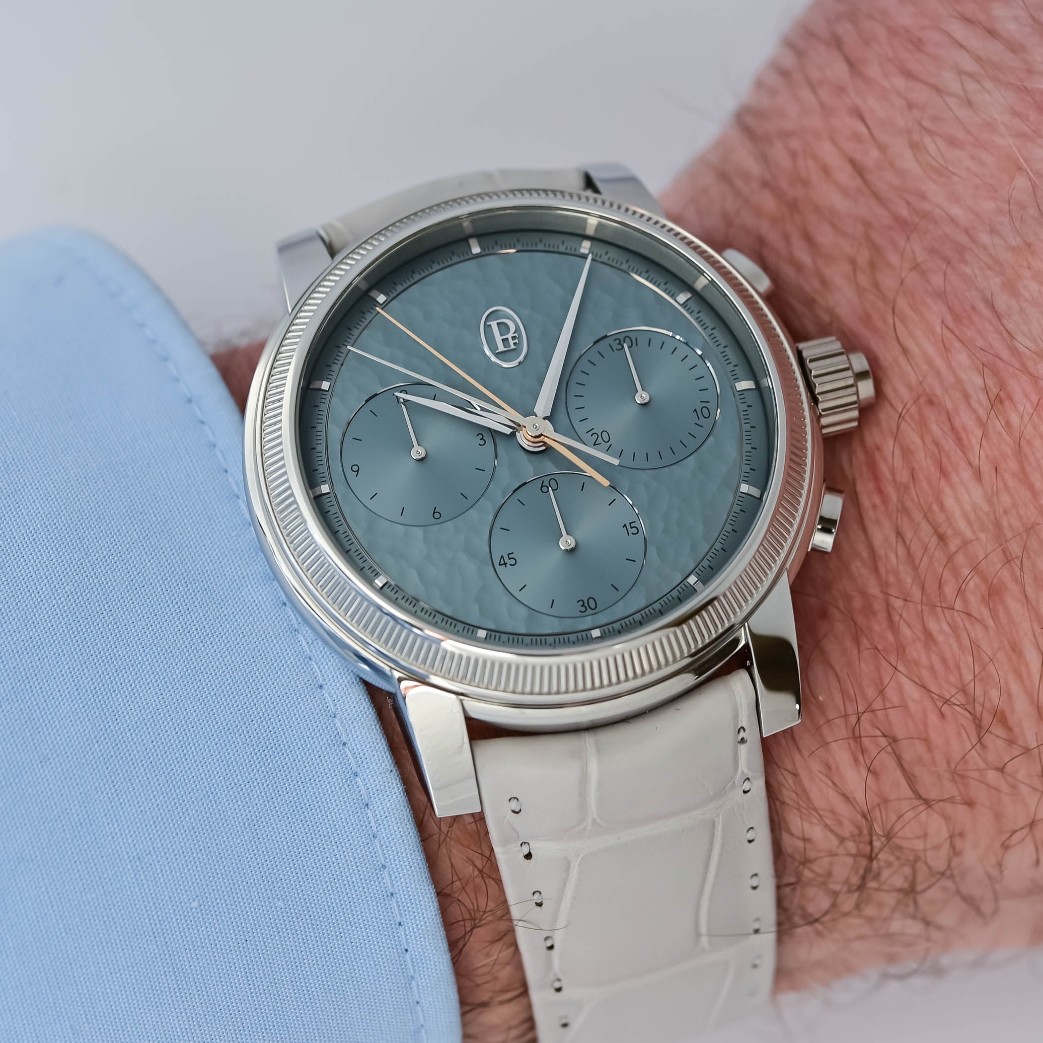 The gleaming knurled platinum bezel frames the Agave Blue hand-hammered gold dial, a beautiful blue-green colour that only Parmigiani could have conjured, hosting three recessed and finely snailed sub-dials. To distinguish the hands, the central chronograph hand is rhodium-plated, while the central split-seconds hand is rose gold-plated for contrast.