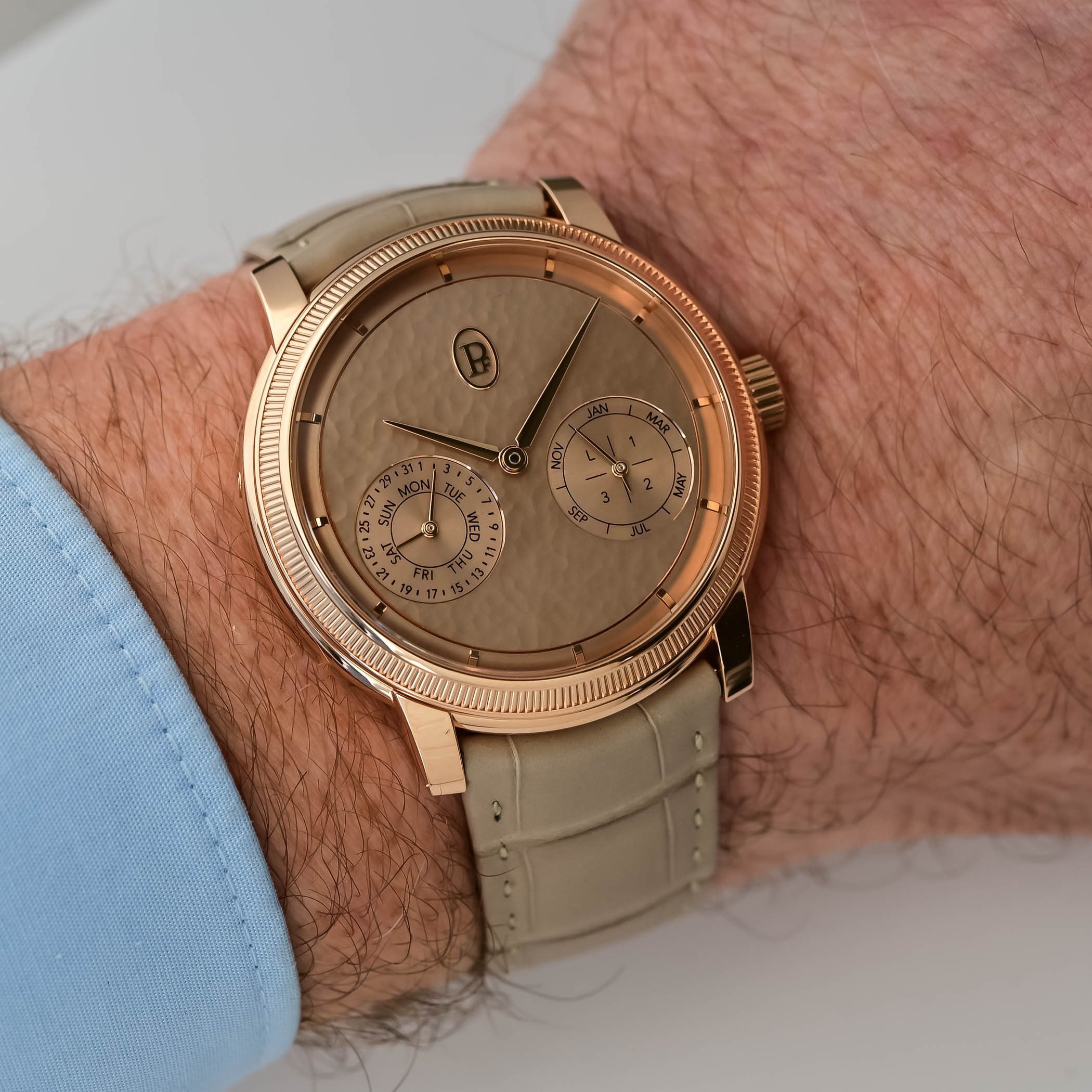 Unlike a smooth, polished surface, the dial’s concave, dimpled surface catches light at different angles, producing brighter highlights on the raised edges and darker shadows in the pits. Overall, the chaotic scattering of light creates a warmer, artisanal appearance in contrast to the more technical yet refined snailing featured in the sub-dials. And speaking of dials, I can’t think of another brand that understands subtle dial colours as well as Parmigiani.