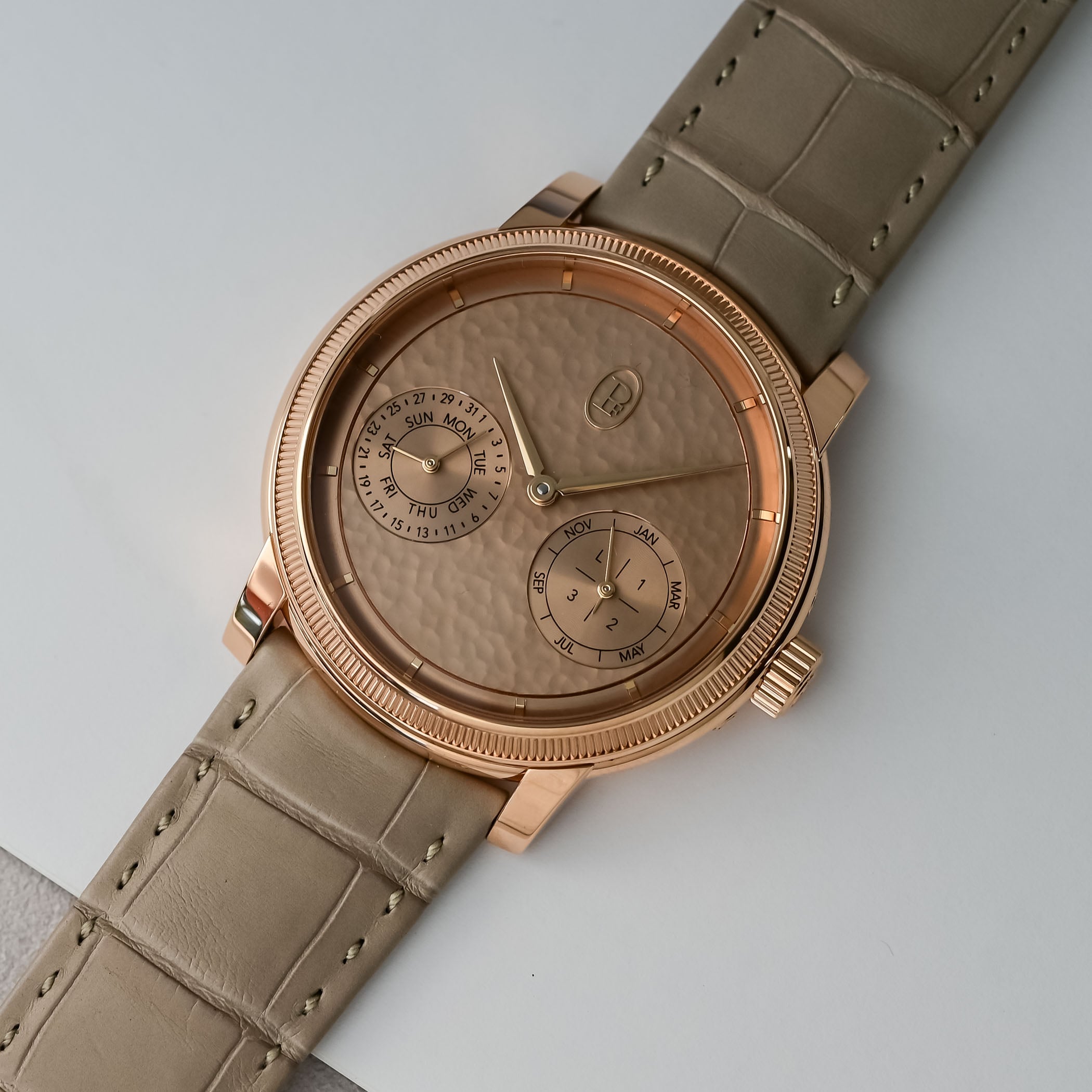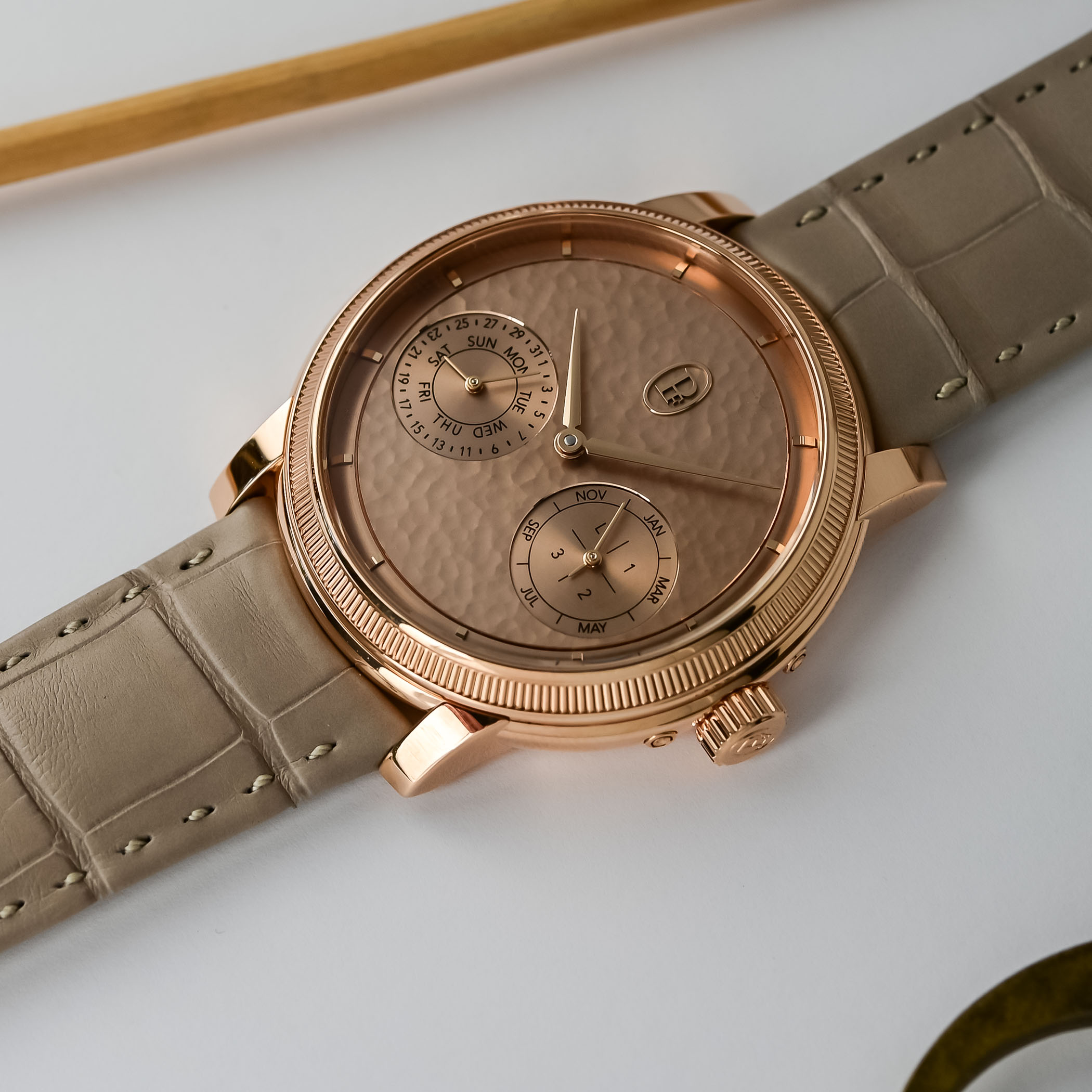 While the case materials, dimensions and functions vary from model to model, they all share hand-hammered gold dials. Executed by a single artisan, the dial is hammered with precision strikes that displace the metal while preserving the flatness required for a watch dial. Given the manual component of this decorative technique, the dimpling varies from dial to dial.