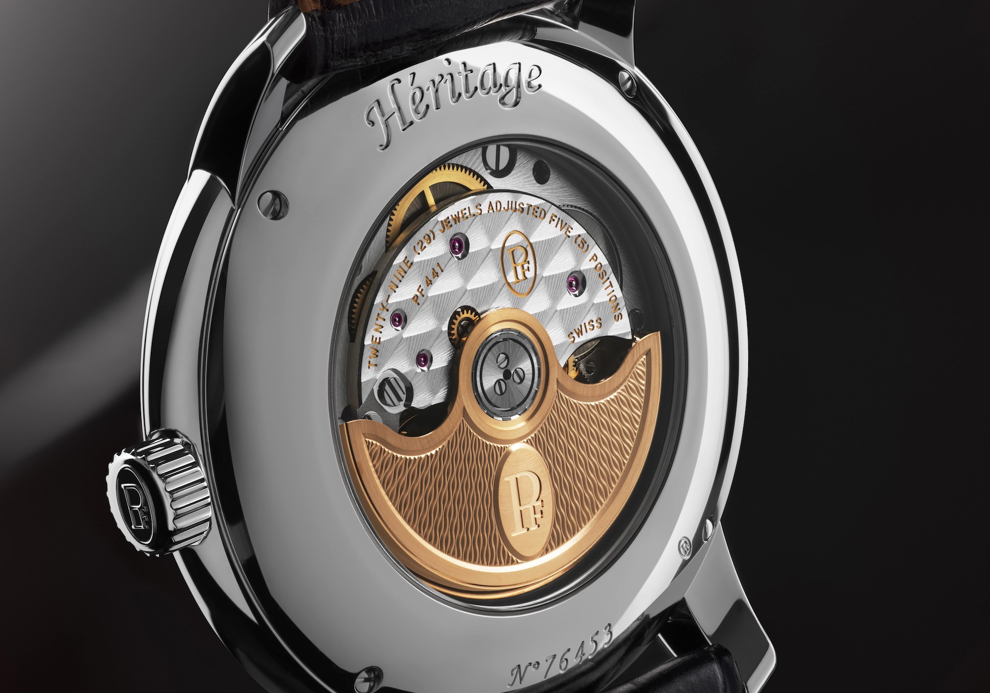 The back of the watch reveals an in-house automatic movement, the calibre PF441. This deceptively simple engine is built around a twin-barrel architecture (55h power reserve), offering a more stable and linear distribution of energy. Also, it features a variable inertia balance (4Hz frequency), which ensures long term stability, greater shock-resistance, and much less sensitivity to the watch wearing position for optimal isochronism. This combination means that this movement meets the most stringent standards for accuracy and reliability, and the watch is chronometer-certified by COSC. The movement is decorated with Geneva stripes, polished angles, circular-graining and all seven bridges are hand-bevelled. The solid 22k rose gold rotor is decorated with a hand-guilloché barleycorn pattern, just like the dial.