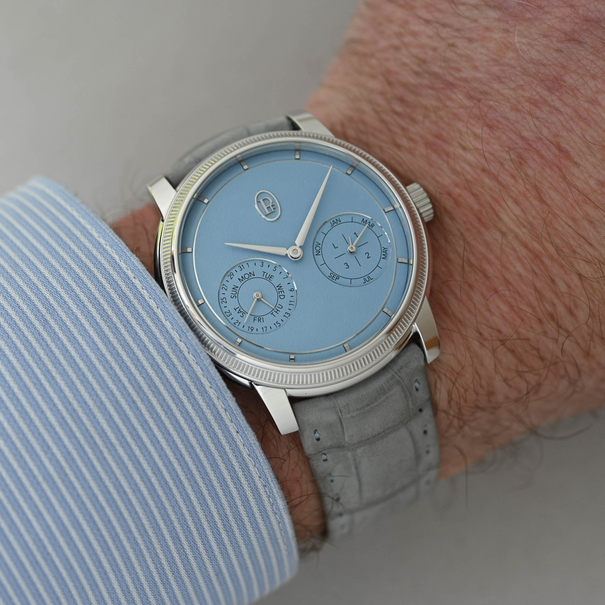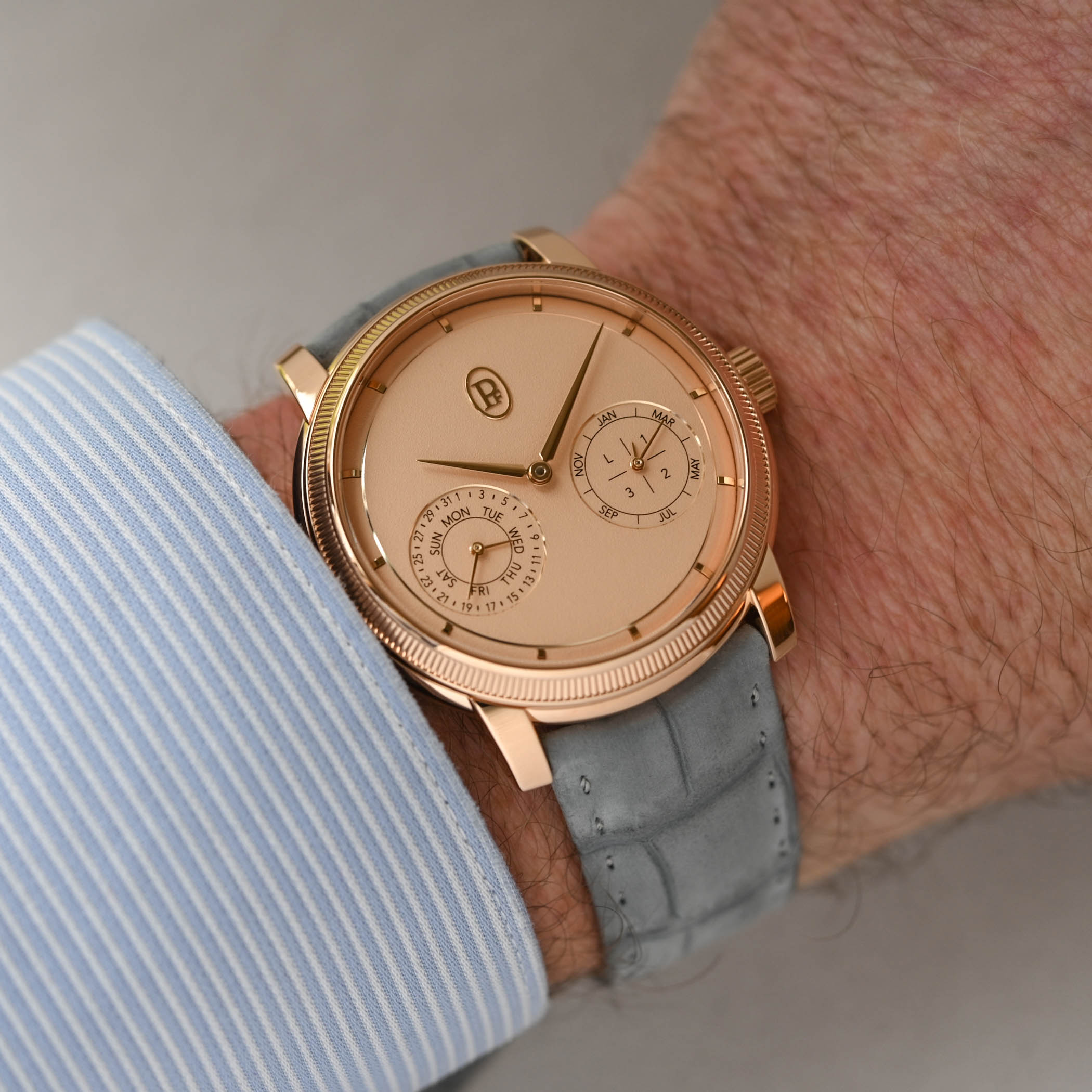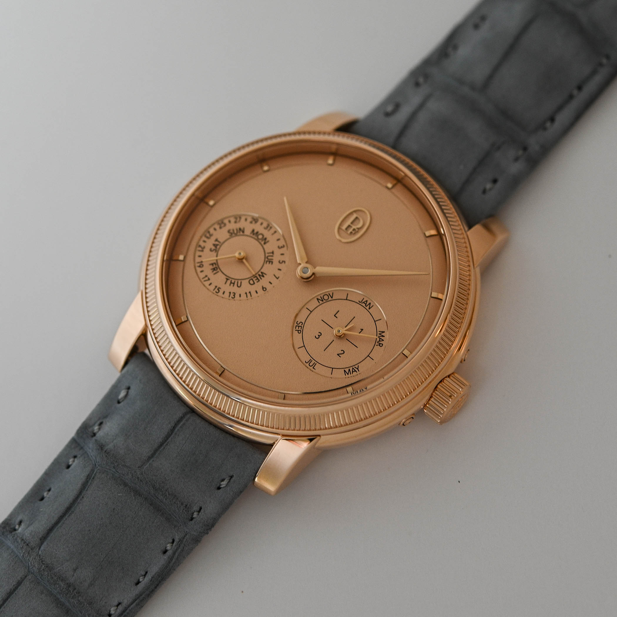 The Morning Blue dial of the platinum edition and the warm Golden Hour dial of the rose gold model are beautifully hand-grained (grenage) to create a subtle matte texture. Slightly concave, the gentle slope of the dial’s perimeter hosts the applied gold hour markers. A white gold or rose gold ring frames the large central area of the dial with the oval PF cartouche applied at noon and the two recessed and gold-framed sub-dials with the calendar information printed in black. The only other elements on the dial are the gold delta-shaped hour and minute hands.