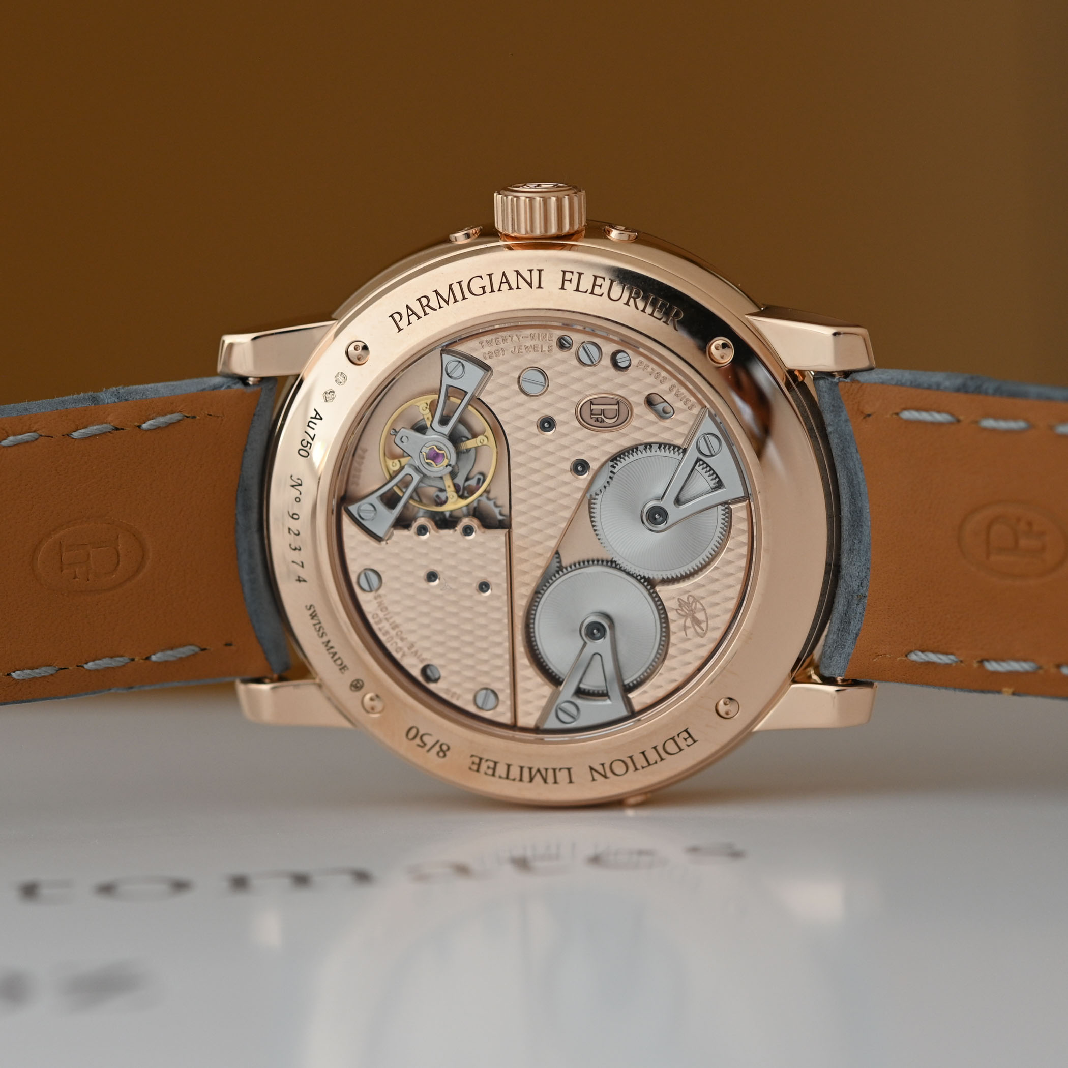 Visible through the sapphire caseback, the new rose gold calibre PF733 showcases its geometric gold bridges with their distinctive Côte de Fleurier finish, as well as the sandblasted gold mainplate. With 265 components, the only elements revealed are the two barrels, storing the 60-hour power reserve, and the 4Hz regulating organ. There are three correctors in the case to adjust the calendar functions.