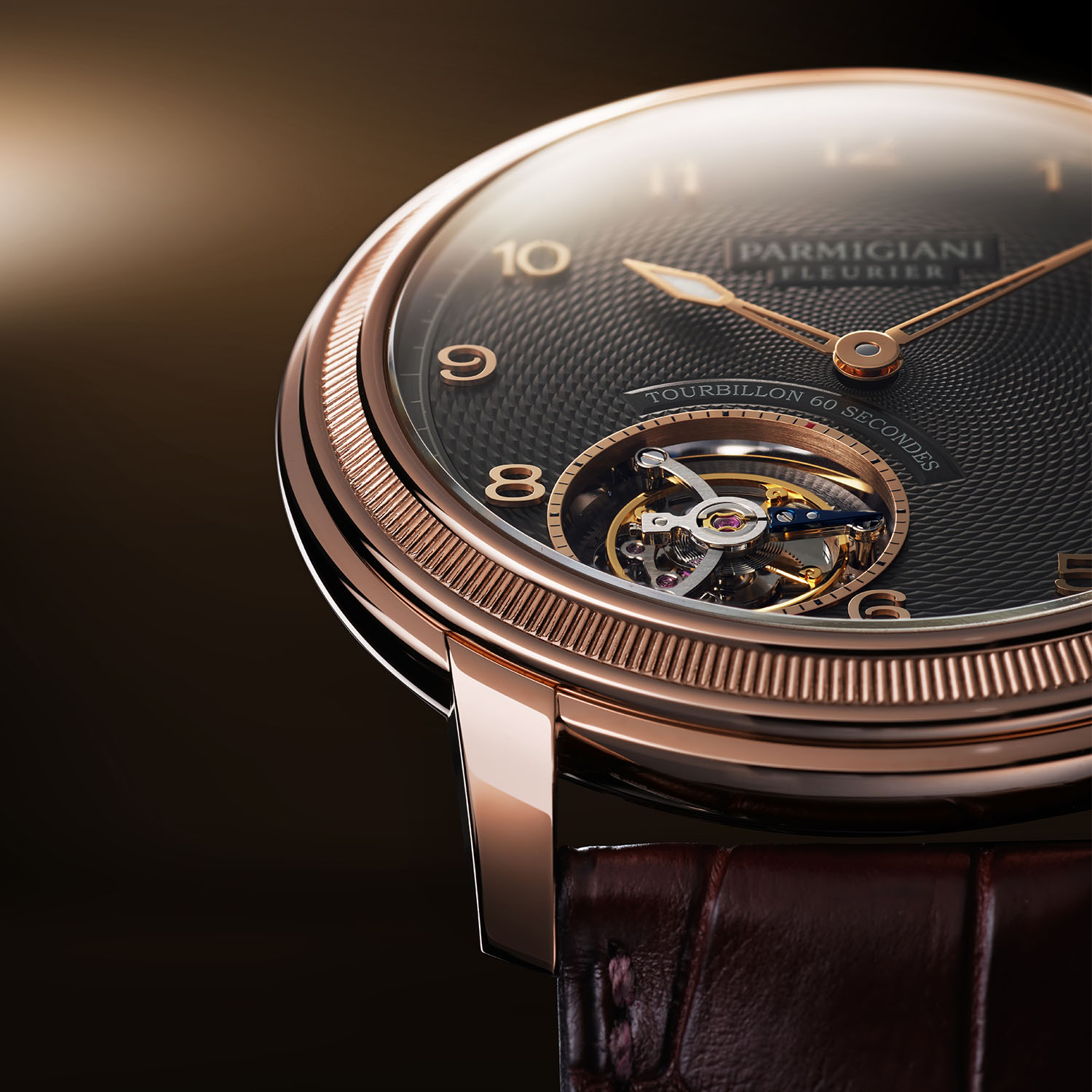 The sapphire crystal caseback reveals the in-house PF517 automatic extra-thin flying tourbillon movement. Like all Parmigiani watches, the movement is beautifully decorated and features circular Côtes de Genève, hand-bevelled bridges and a barleycorn guilloché engraving on the platinum micro-rotor. With 207 parts, a 3Hz frequency and a power reserve of 48h, the movement measures 32mm diameter and has an ultra-thin height of 3.4mm.