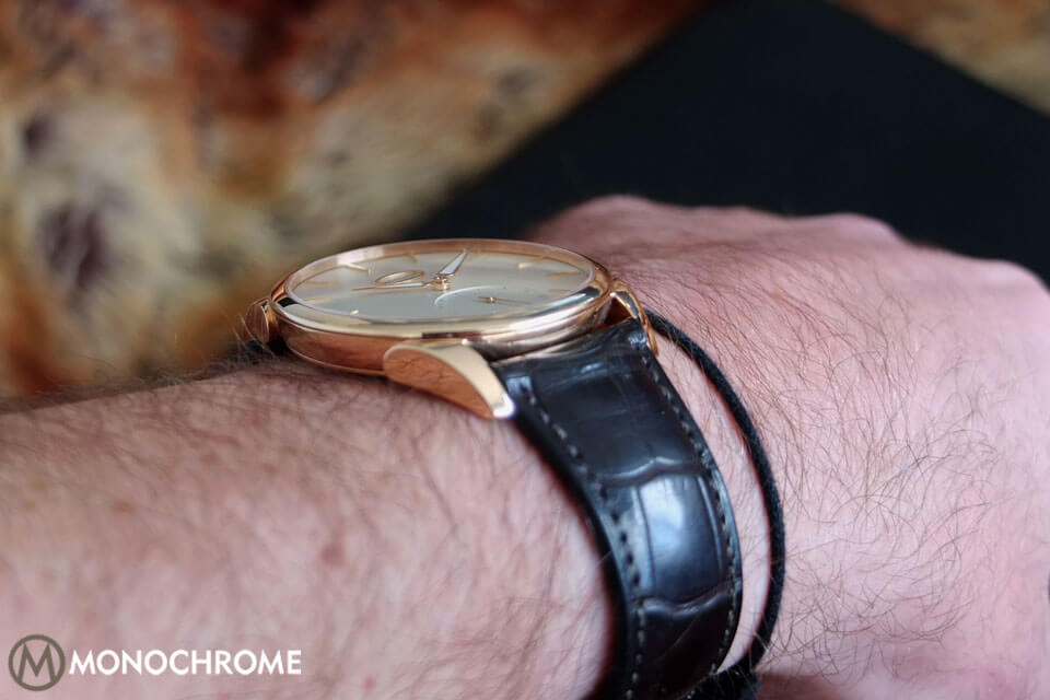 The hands are slightly out of the ordinary for a classical dress watch. The delta-shaped hands feature a luminescent coating, which make it easy to read the time during the darker hour of the day and even at night. Not that the luminescent material is as strong as on most diver watches, yet it is strong enough to tell the time. The small second hand is without luminescent material, and is either rose or white gold plated.