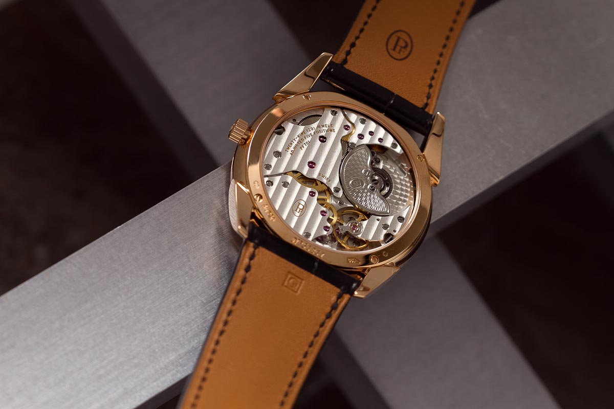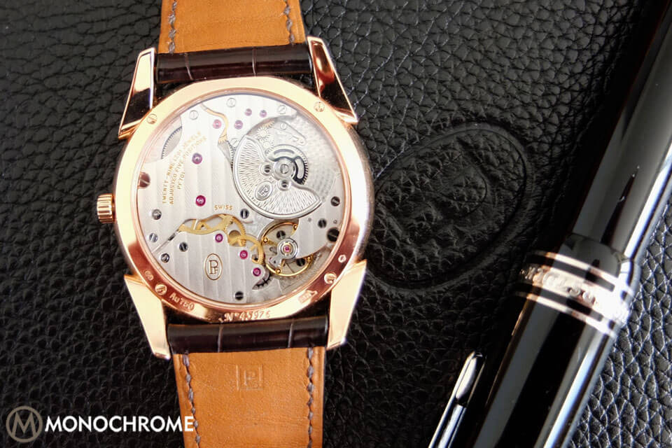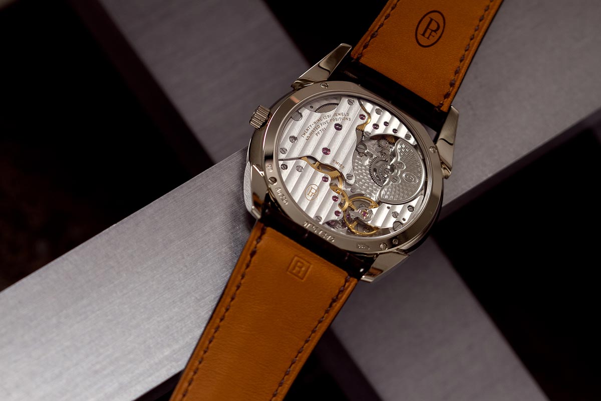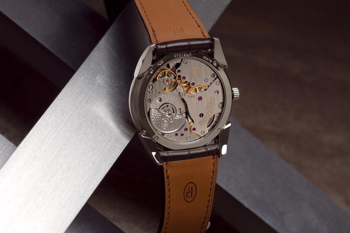 When the watch is turned over, a see-through case back shows the intricate beauty of caliber PF701. A sight that will impress not only laymen, but also the seasoned watch collector. And rightfully so, because this movement features a micro-rotor that ‘harvests’ the energy of your wrist movements and transfers that to winding the main spring. Due to their nature, the winding mass of a micro-rotor movement does not overlap the beautiful movement and everything is still fully visible to be admired. And there’s a lot to admire!