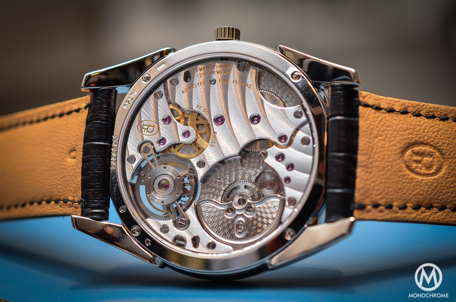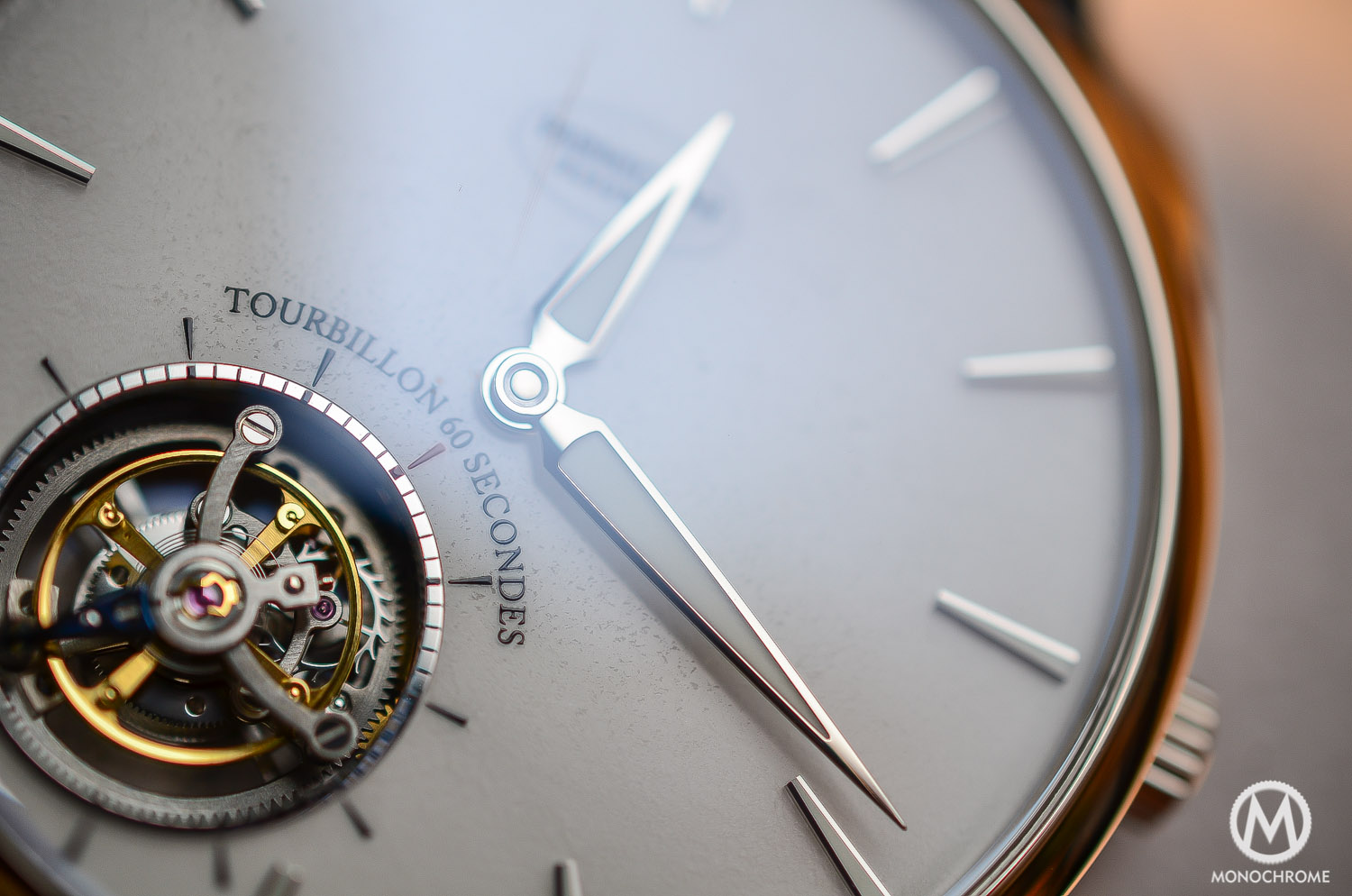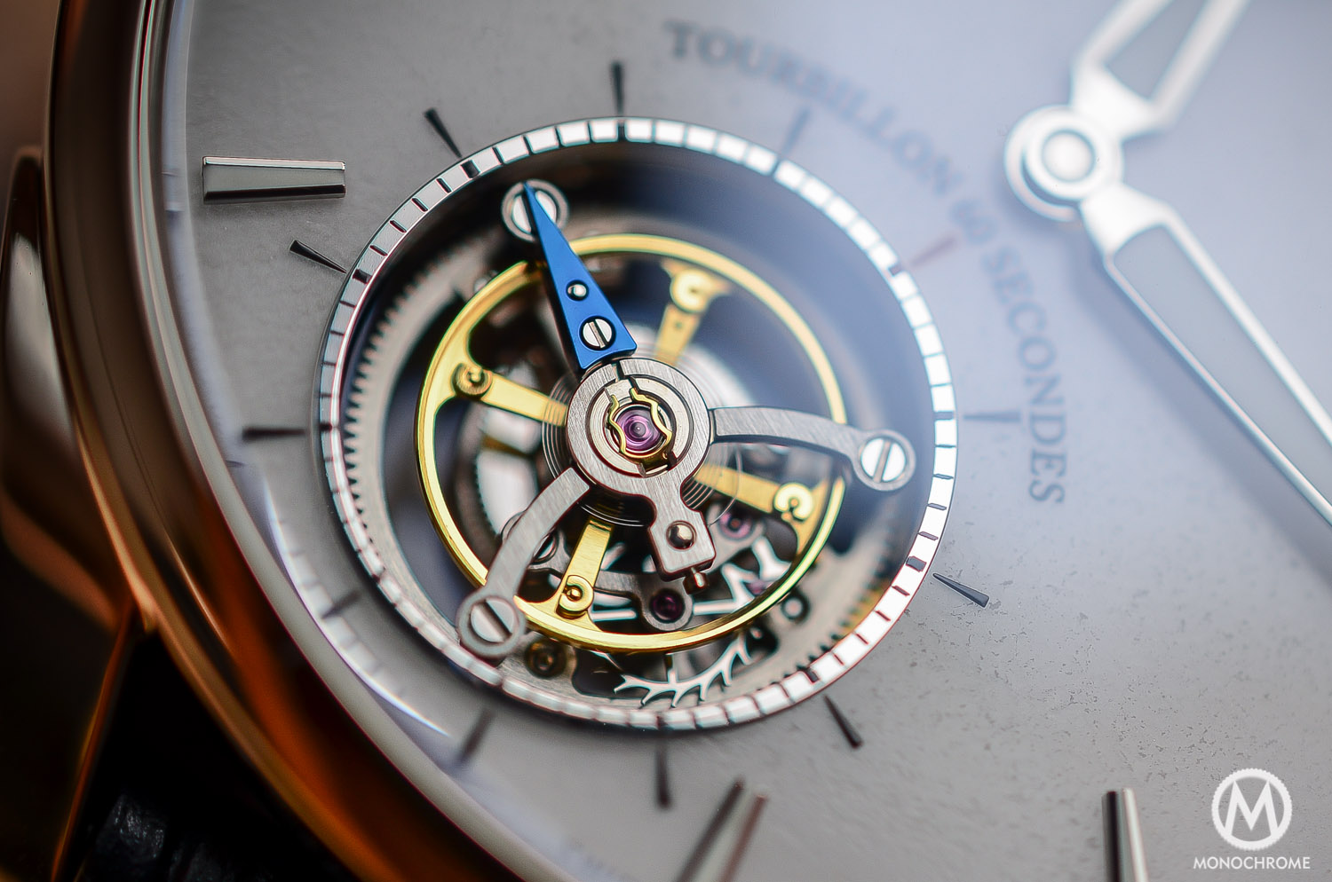 The one-minute tourbillon is elegantly off-centered at 7 on the dial. It comprises a small second indicator (the most natural position for a small second on a tourbillon…) and the cage is, like the rest of the movement, superbly finished. The balance wheel is a variable inertia one instead of a screwed one. Variable inertia are small weights that can be rotated, in order to poise the balance, and thus regulate the rhythm of the balance. With a screw-balance, the small screws serve the same purpose as the poising weights, however these small screws protrude outwards and catch more ‘air’. The use of variable inertia offers a more streamlined structure, giving the tourbillon more stability throughout its operation. Also note that this is a flying tourbillon, meaning that rather than being supported by a bridge at both the top and bottom of the movement, the flying tourbillon is cantilevered, being only supported from one side (something that also participates to the thinness of the movement).