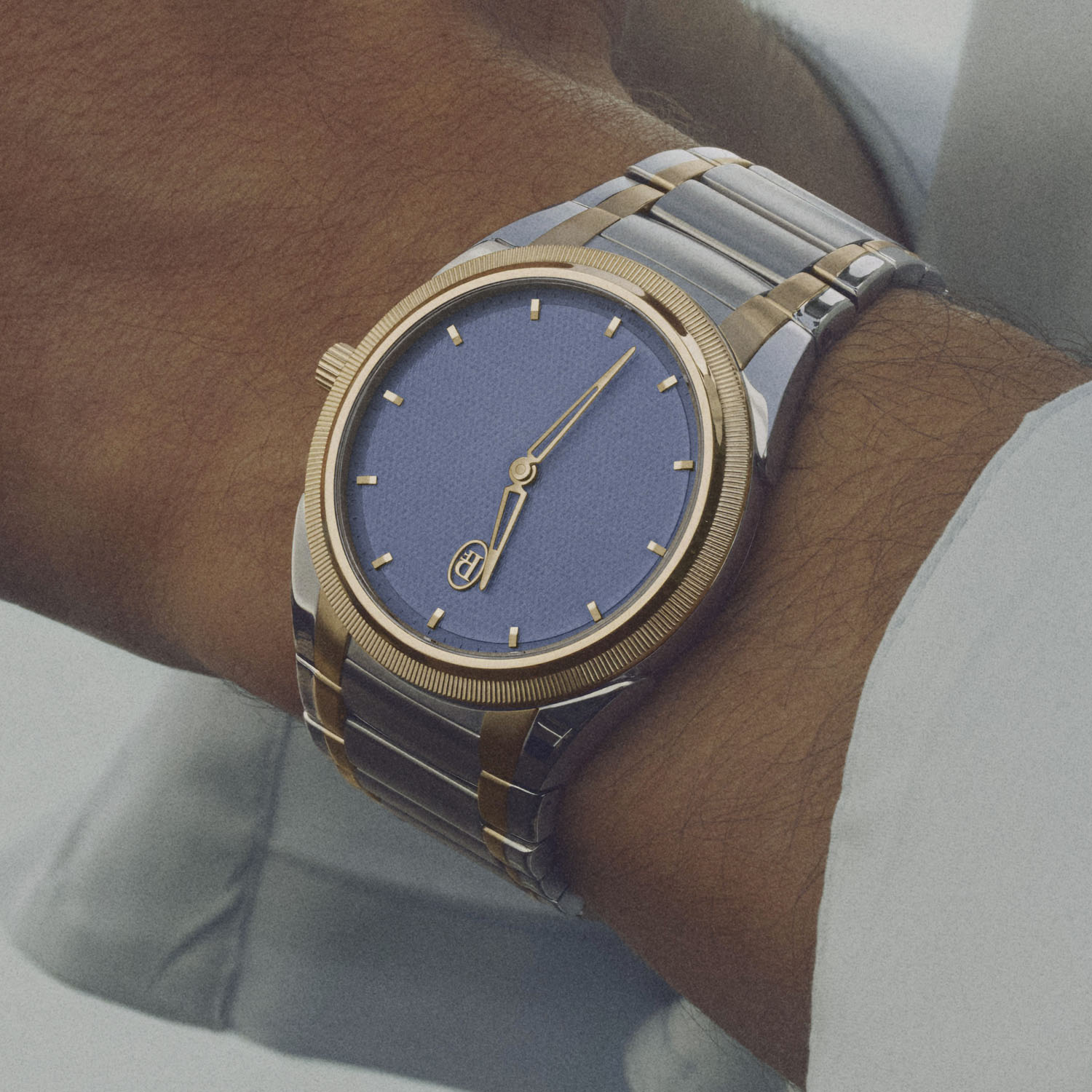 Launched in 2021, the Tonda PF collection fulfilled two needs with one deed. On the one hand, it celebrated Parmigiani Fleurier’s 25th anniversary and the illustrious career of master watchmaker and founder Michel Parmigiani; on the other, it marked a trial by fire for the new collection, overseen by the newly appointed CEO, Guido Terreni. Happily, the refined luxury sports watch collection, complete with the beautiful tear-drop lugs of Michel Parmigiani’s original Tonda and the knurled bezel of the Toric, was well-received and praised for its sophistication and understatement. One of the foundation pieces was the Tonda PF Micro-Rotor. Originally issued with a date window, the slim Micro-Rotor streamlined its minimalist dial even further and was revisited last year without a date function. Joining the no-date models, Parmigiani releases an eye-catching two-tone steel-and-rose-gold version with a beautiful Stone Blue dial.