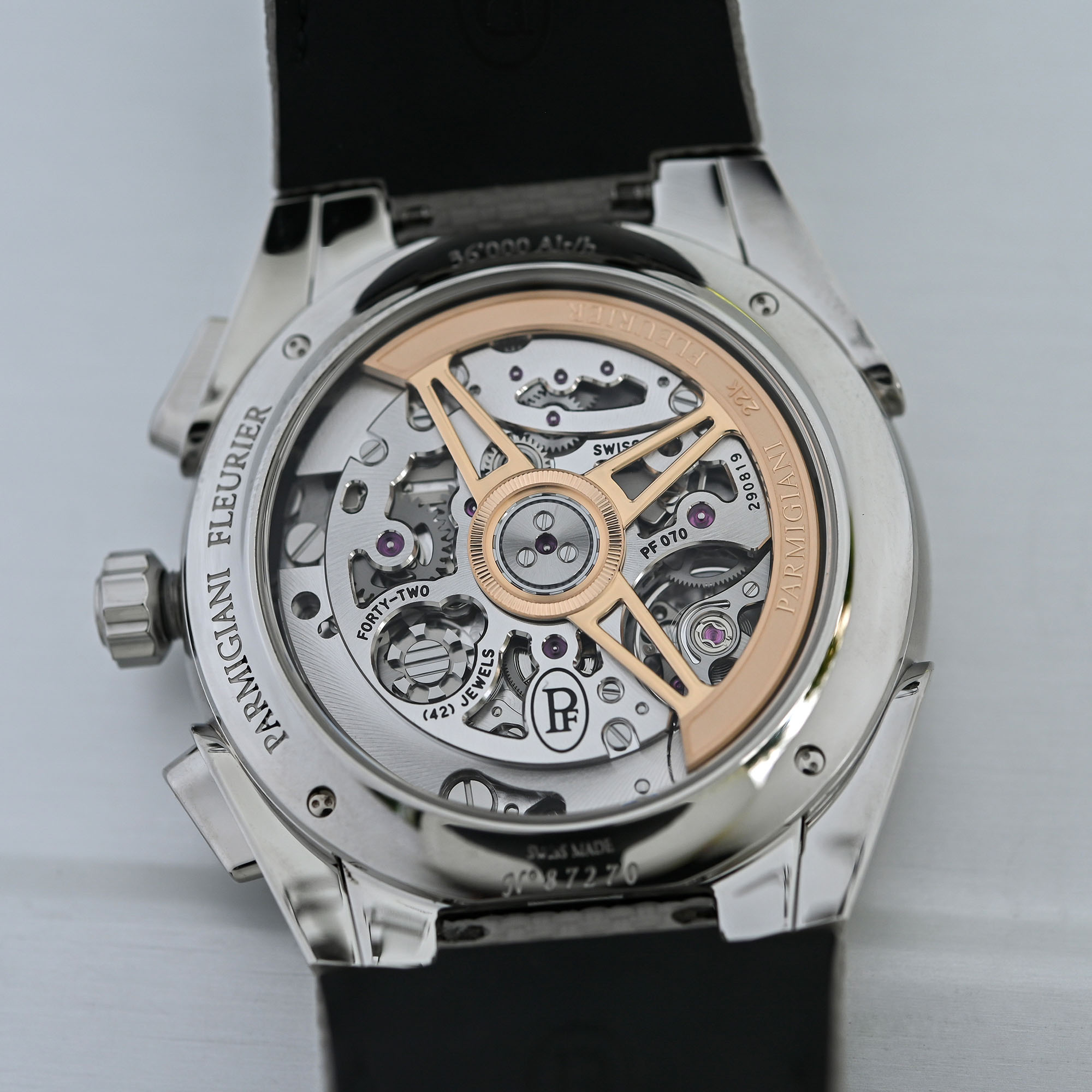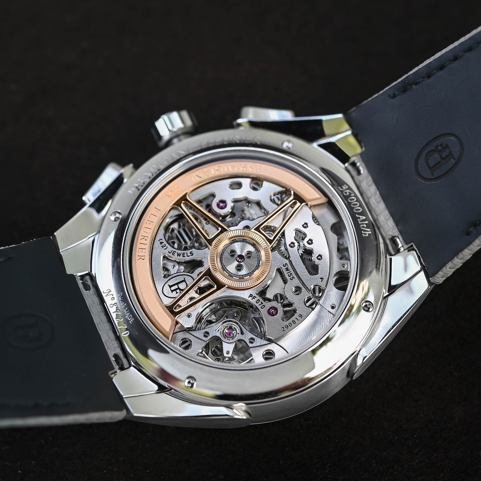 Besides these new dials, these new Tonda PF Sport Chronograph variations retain the essential characteristics of the models introduced in 2023, starting with their 42mm steel case with signature teardrop-shaped lugs and knurled bezel. As far as their engine is concerned, we still have the automatic calibre PF070. This high-grade chronograph is made in-house – together with sister company Vaucher Manufacture to be precise. Measuring 30.6mm in diameter, it is a modern and relatively compact construction, just under 7mm thick. A close look at its design reveals that it combines several of the best practices from iconic chronographs and several innovations.