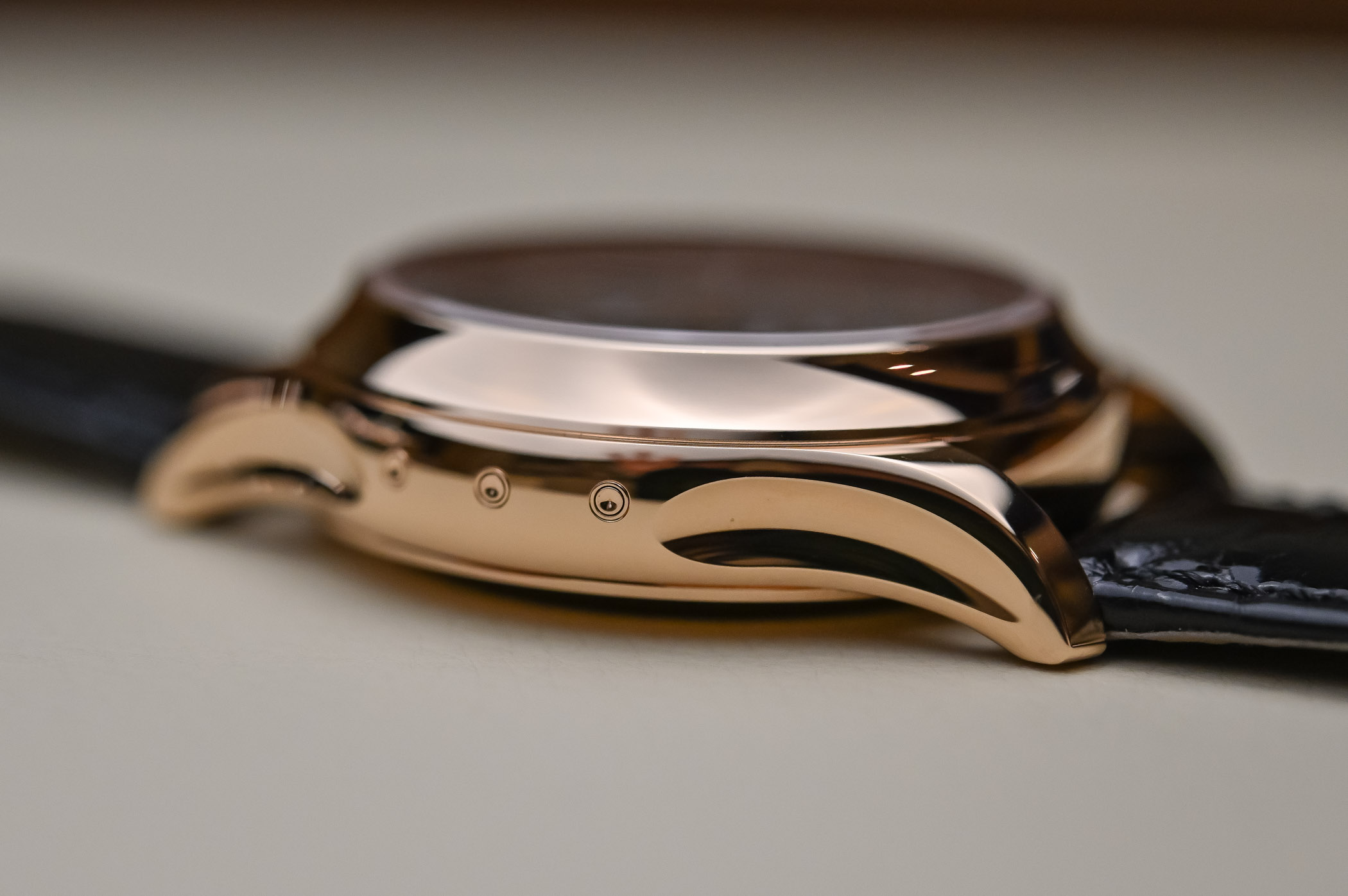Yeah, gold and brown sometimes don’t excite my imagination (although Urban Jurgensen’s 1140L and Voutilainen’s Vingt-8 in that combination are wonderful), but this works well – perhaps even more desirable than the blue dial. I have exactly the same concern about the size and thickness of the case as Brice, though.