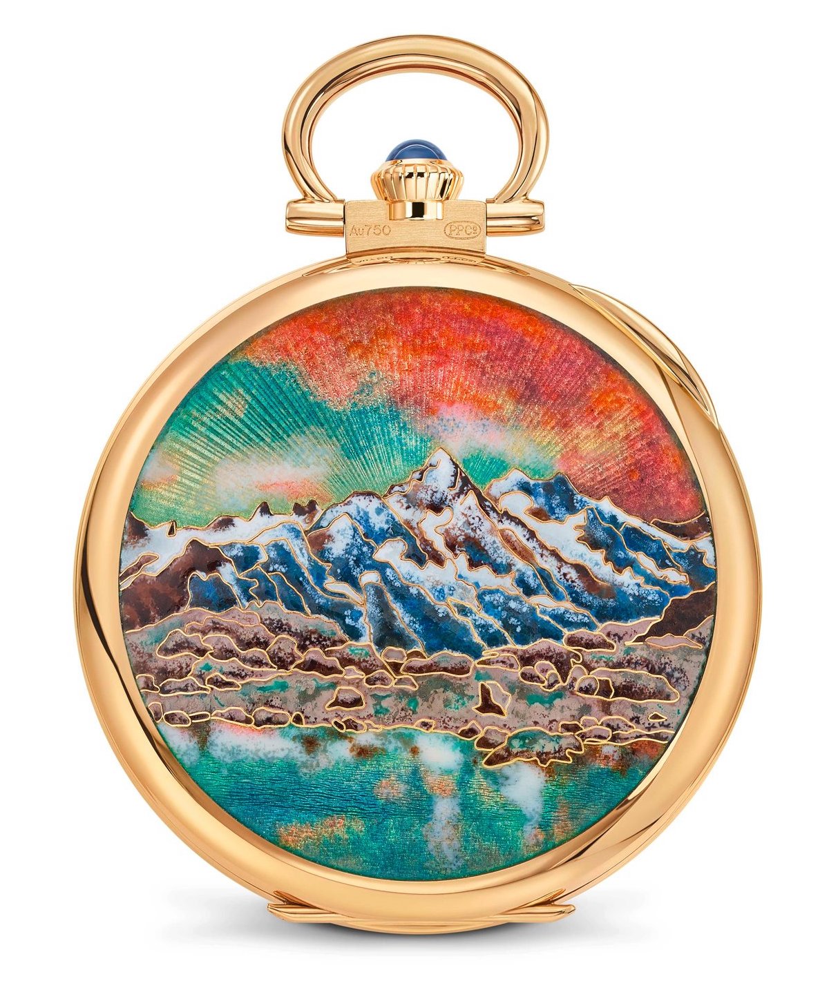 Above: 992/108J-001 “Lac Blanc” pocket watch with cloisonné enamel over guilloché work and hand engraving, presenting the panorama of the Mont Blanc massif as seen from Lac Blanc, above Chamonix. Lepine hand-wound calibre with small seconds