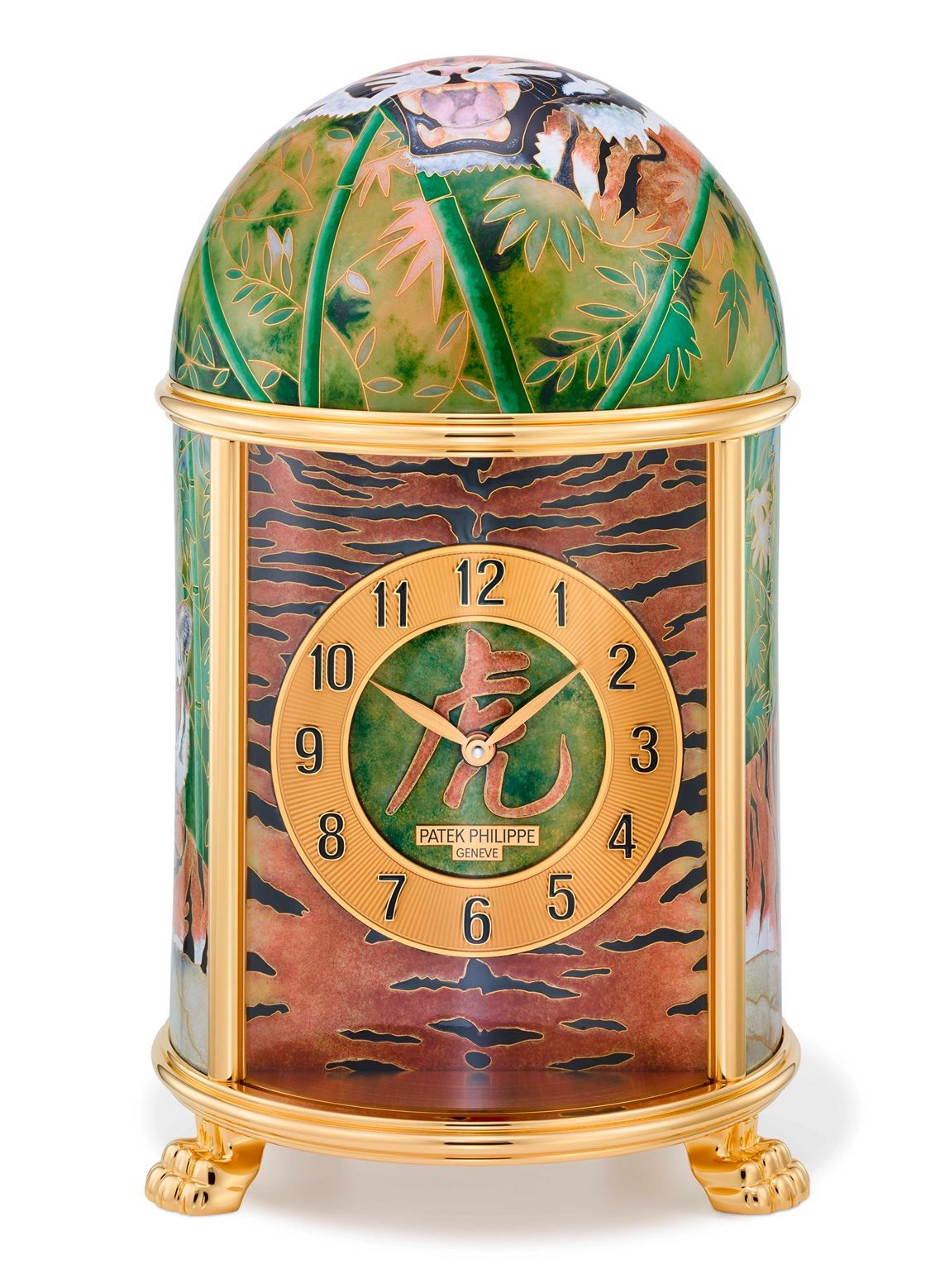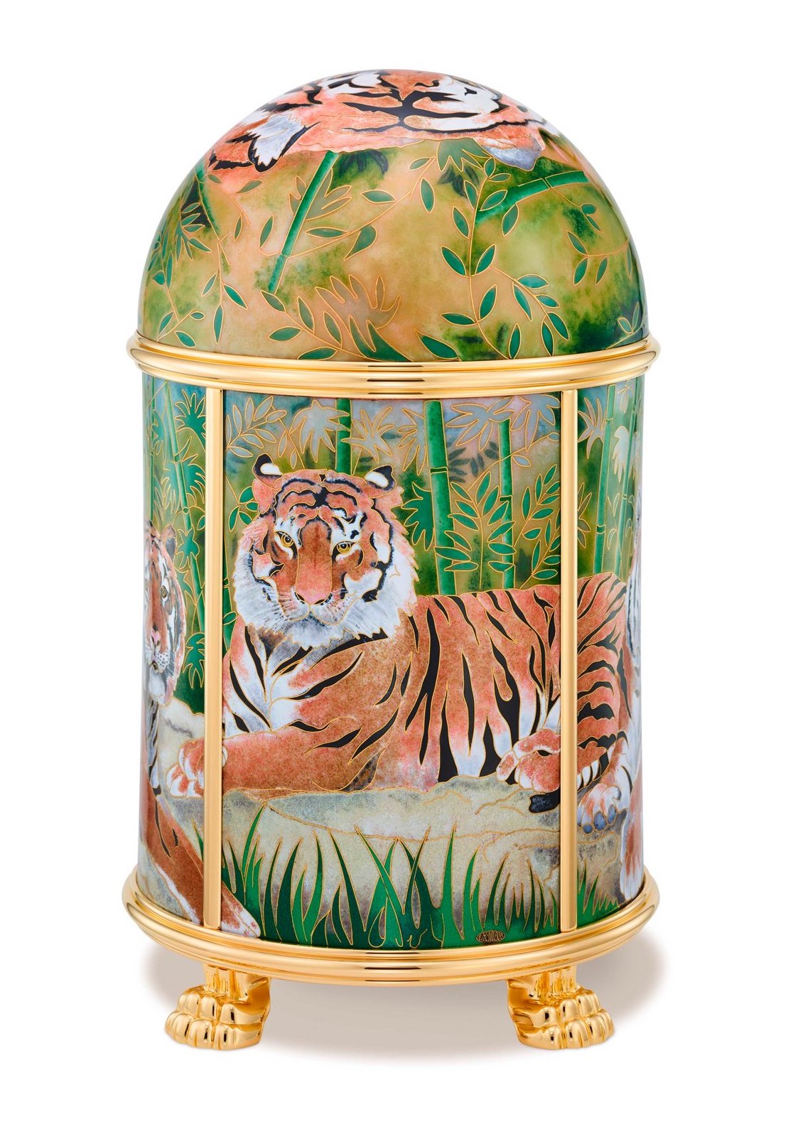 Above: 20090M “Tigers” Dome table clock in cloisonné enamel powered by a mechanical movement rewound by an electric motor