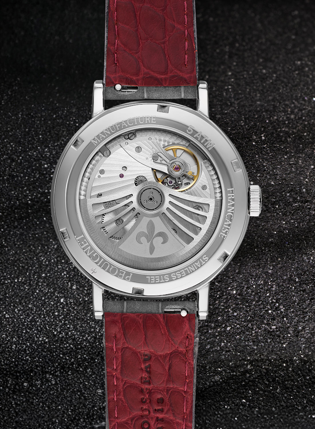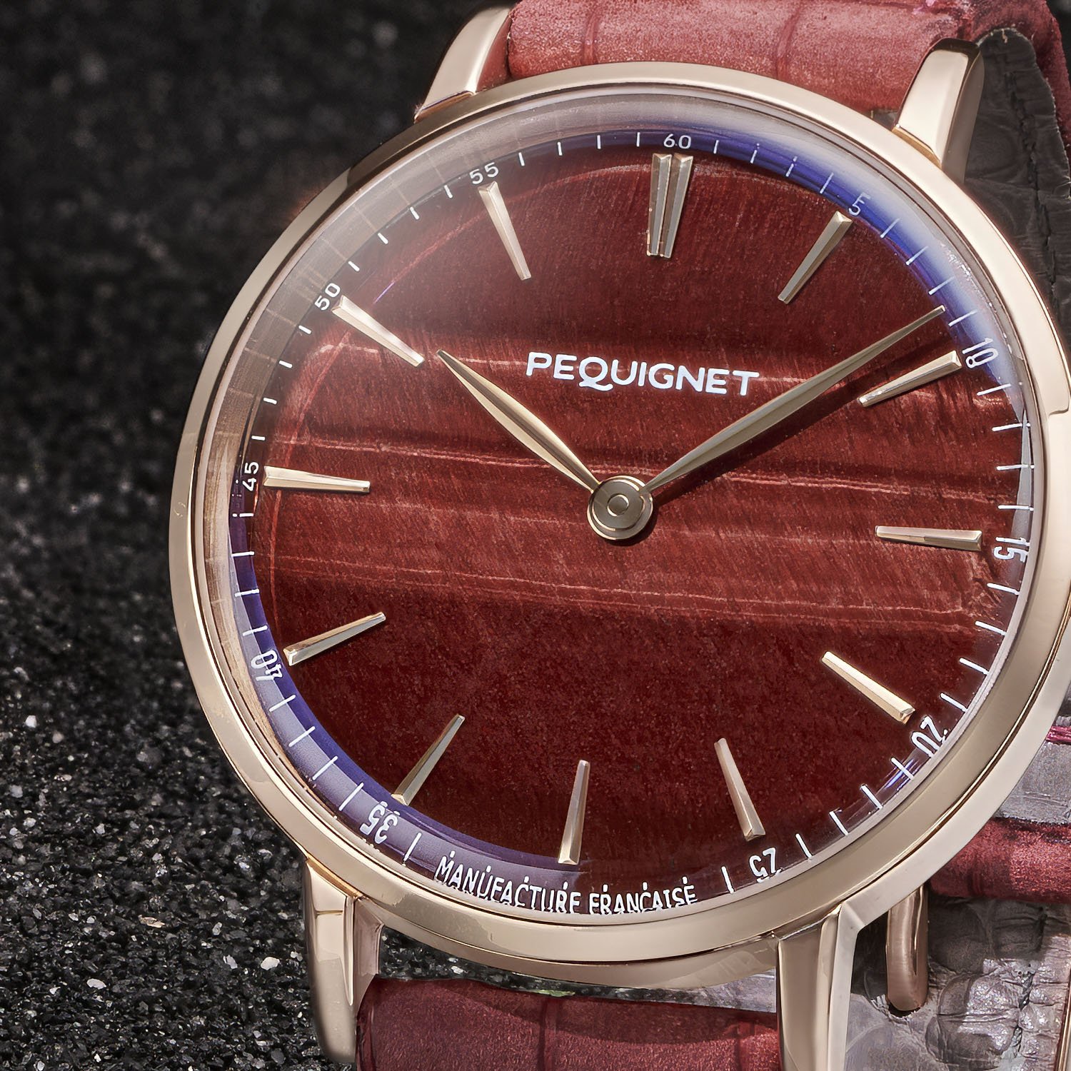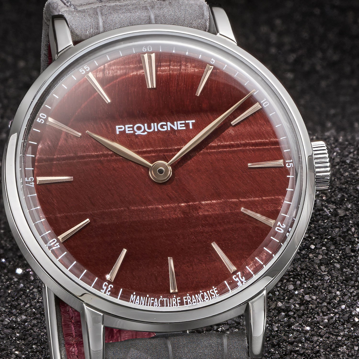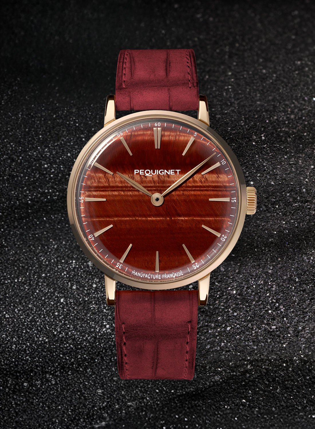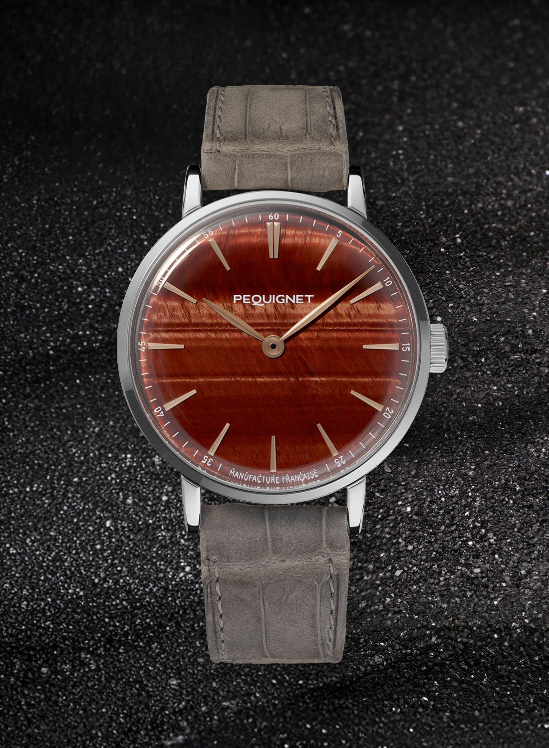 The clean, understated dial allows the Tiger’s Eye to take centre stage. The applied indices have a rose gold finish, matching the leaf-shaped, rounded and polished hands. The only information on the dial is the white minutes track printed on the periphery with Manufacture Française below.