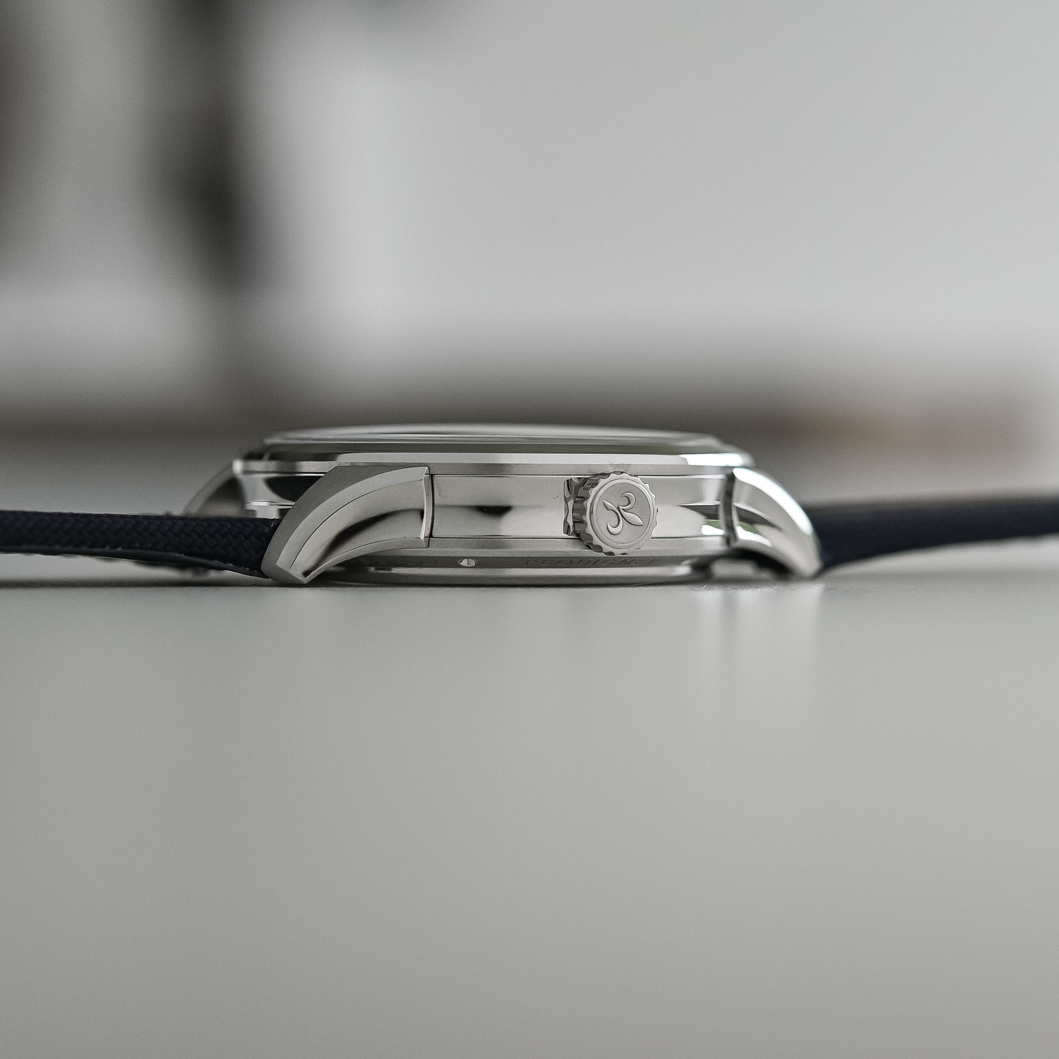 The power reserve indicator spanning the lower left part of the dial is depicted with elegant minimalism and features a simple arced track and a red marker to indicate the depletion of the generous power reserve. Directly opposite and framed by a silver ring, the small seconds counter has a snailed interior. The only trace of luminescence is found on the slim, polished steel hour and minute hands treated with blue emission Super-LumiNova. Discarding the somewhat fuddy-duddy applied fleur-de-lys logo of earlier editions, the new Royale Paris model also reduces the inscriptions on the dial, sticking to the brand name in relief at noon and “Manufacture Française” printed in the concave trench.