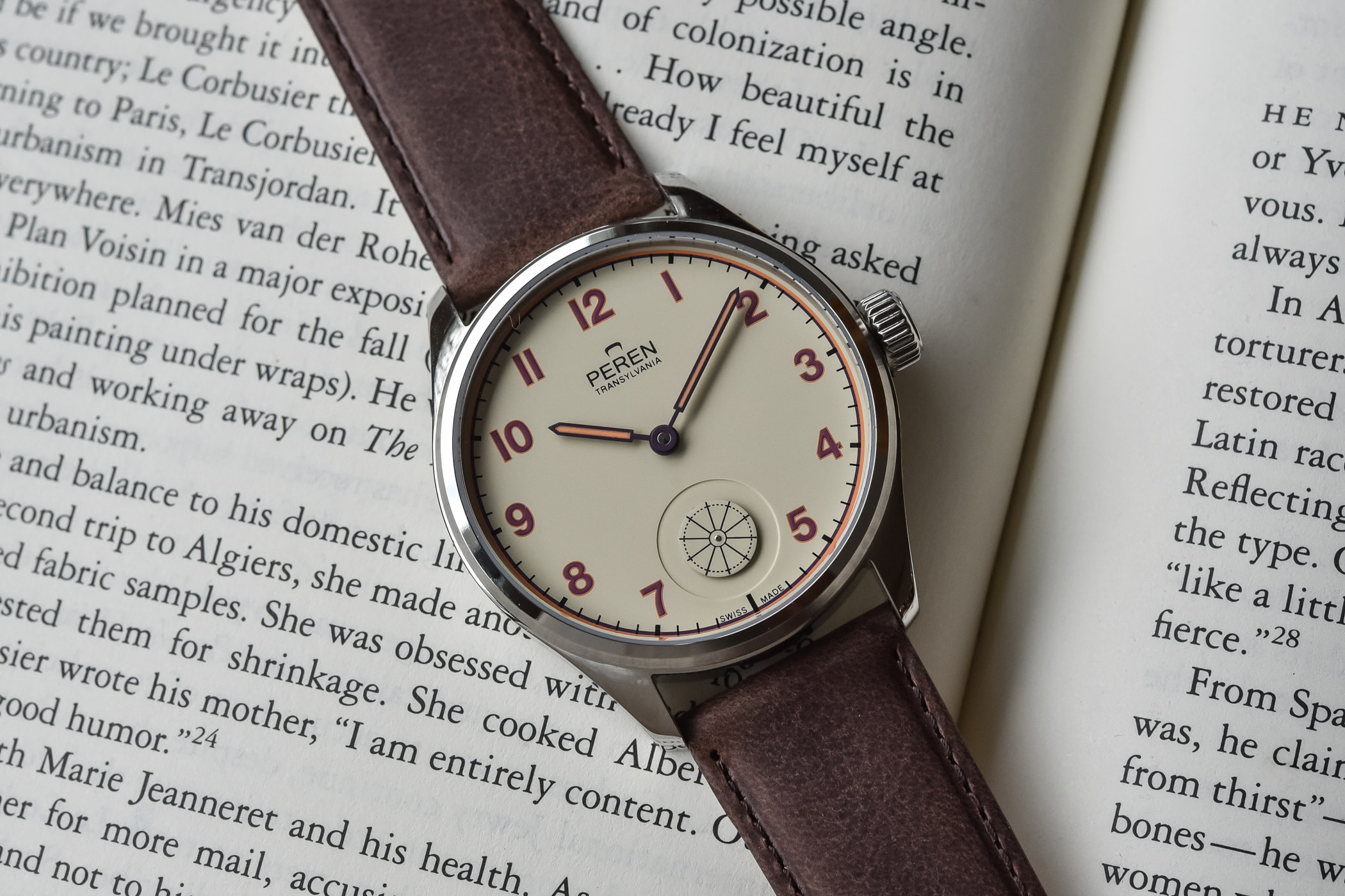 The Peren Hintz is presented on an attractive brown calf leather strap fitted with a steel pin buckle. It is pleasant and wears as comfortably as you can expect for a 42.5mm watch, the curved lugs and soft leather strap contributing in full. The large knurled crown is easy to wind and pull to set the time. Despite the old school looks, the watch has quite some presence on the wrist with its large dial opening, distinctive hands and numerals, and original details.