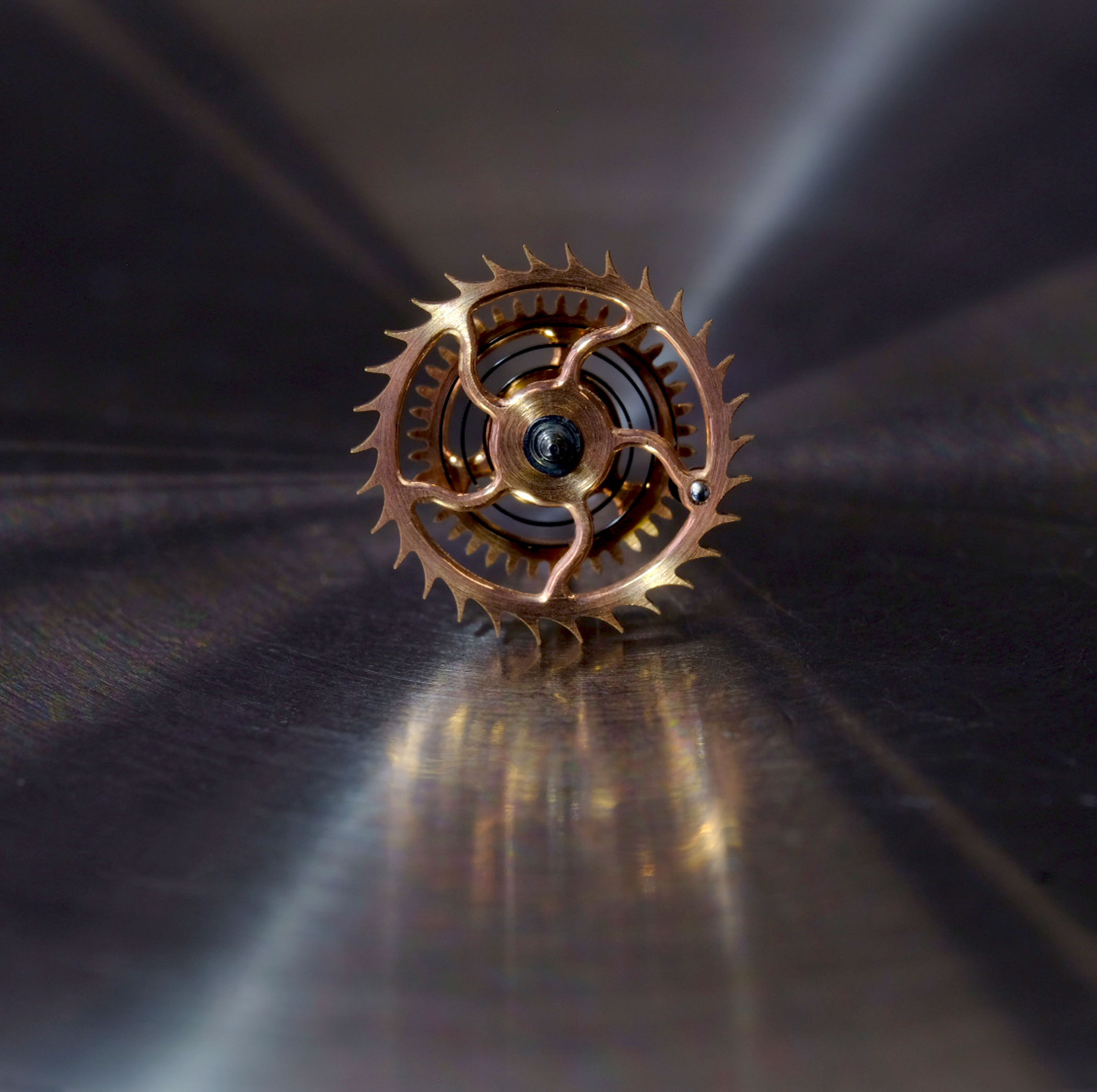 This rare way to display the time for a mechanical watch is driven by a beautiful hand-wound movement, fully handcrafted by Gael Petermann and Florian Bédat. The Calibre 171 was designed in collaboration with Dominique Renaud, their neighbour in Renens. Its deadbeat seconds mechanism was inspired by that of a pocket watch with tourbillon and seconde morte by Robert Gafner.