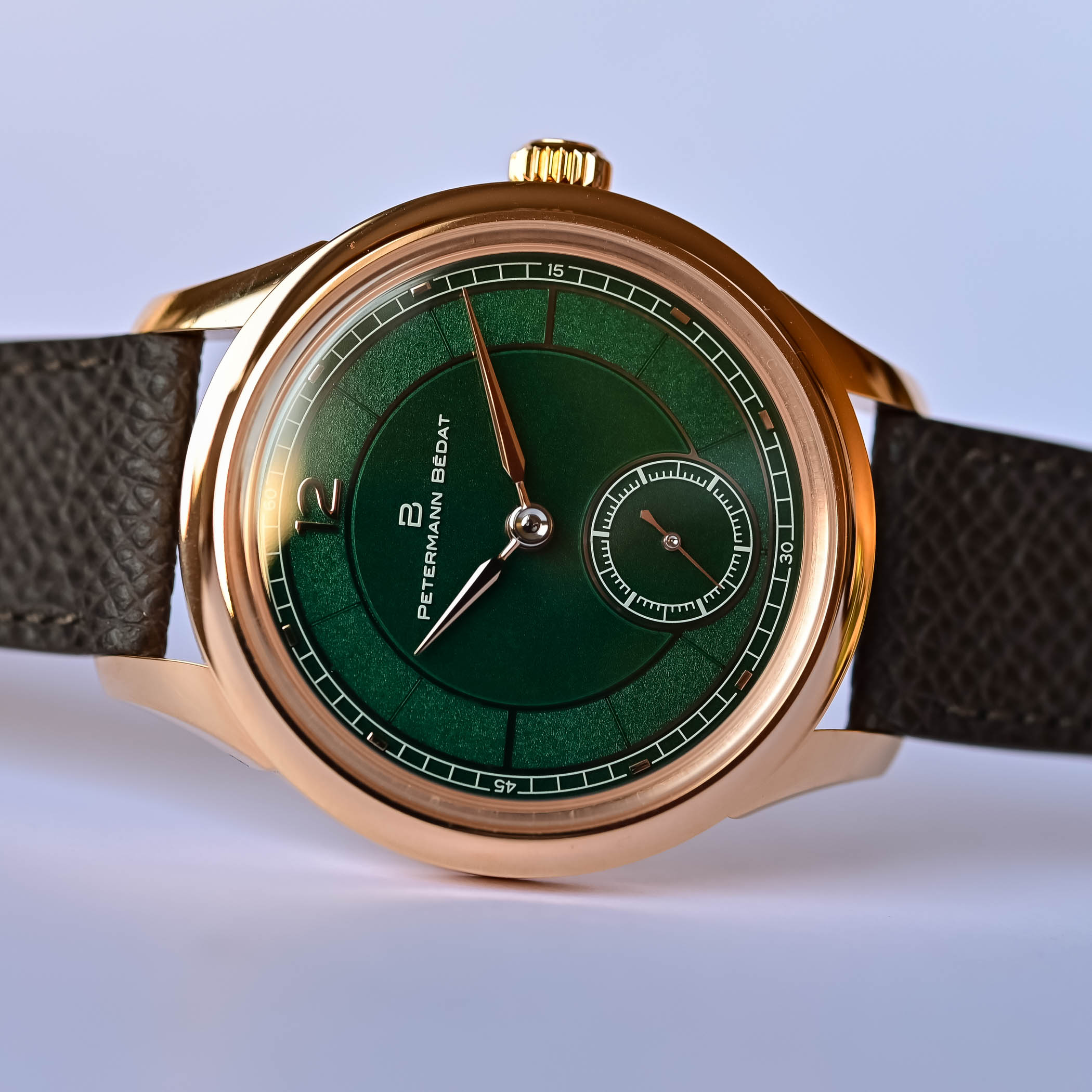 The Petermann Bédat Reference 1825 is paired with an alligator leather strap and a pin buckle. The model (this green dial edition and upcoming variations) will be produced for 4 years, with a target to manufacture about 50 watches per year, or 200 pieces in total. For now, preorders will be accepted only for the first two years and will later be opened to the following two years, as Petermann and Bédat want to avoid having waiting lists over too long a period. The first deliveries are announced for the beginning of 2026.