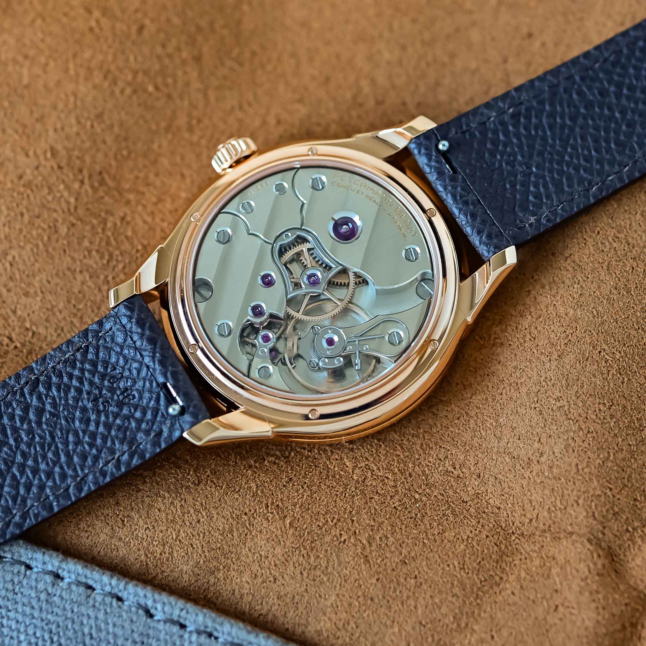 Measuring 38mm in diameter, the rose gold case follows the design of their split-second chronograph, with obviously a thinner profile at 10.15mm. It features sloping, individually soldered lugs, a slightly curved profile and a concave bezel. The crystal rises slightly above the bezel. Turning the watch over, the exhibition case back is secured by 6 screws. It offers an unimpeded view of the superb hand-wound in-house calibre 233. If the keyless works and the escapement are the same as for the previous movements, the rest of this calibre is entirely new, with a new gear train and a new architecture.
