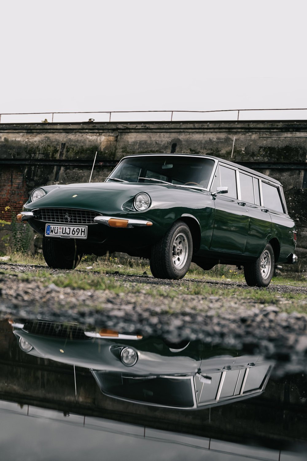 This process resulted in a V12 powered car, with a three-speed automatic transmission and drive to all wheels. Later on, the engine was replaced with a Chevrolet V8 and the car was painted dark green instead of the original white. One of the quirky little details is the custom badge on the Ferrari-nose, with an image of Eugene the Jeep, a Popeye comic book character.