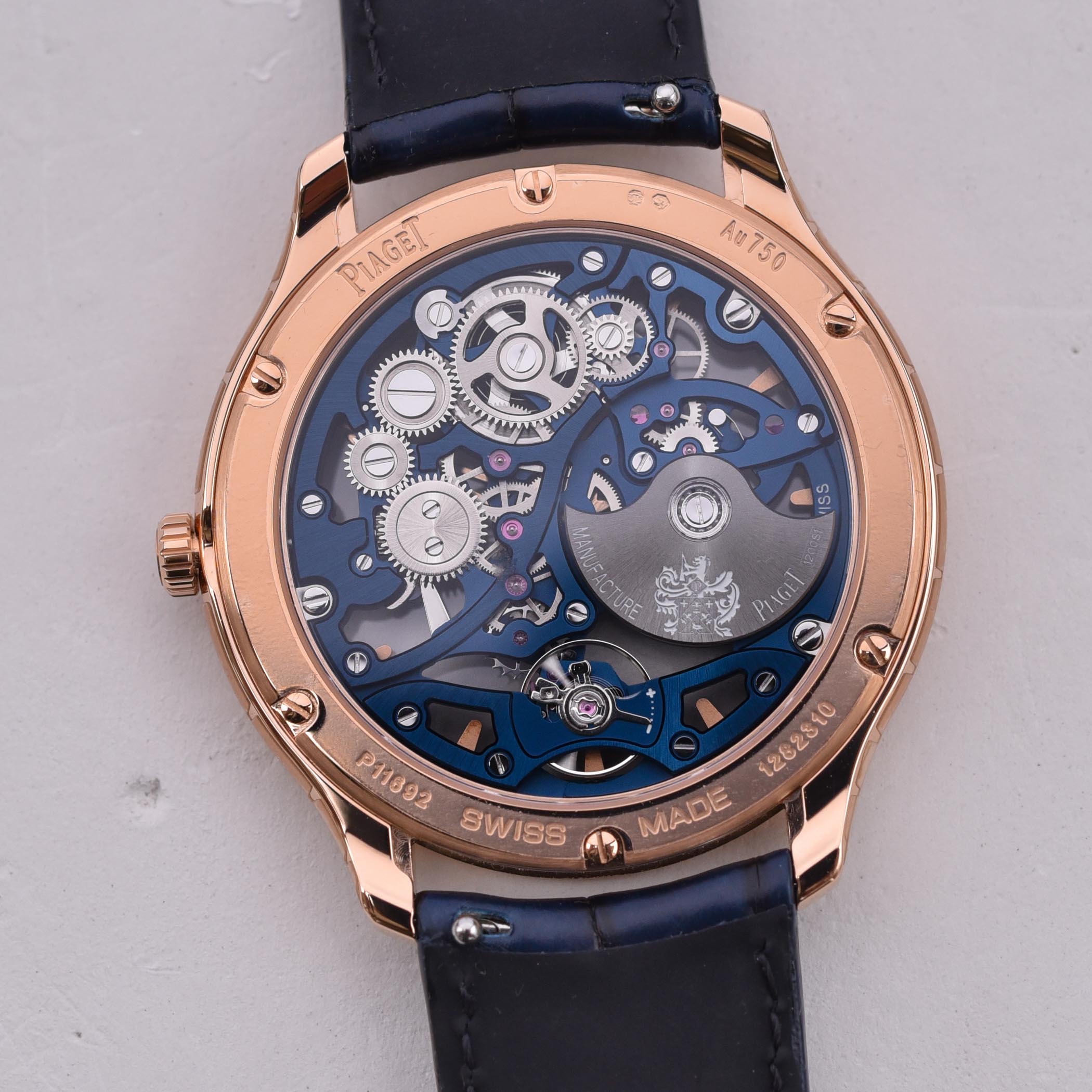 The two first models are presented in 18k rose gold and diamond-set 18k white gold. These new editions use the same case as before, with dimensions that are identical to the steel versions – 42mm in diameter and 6.5mm in height. The bezel of the white gold version is set with 56 brilliant-cut diamonds for a weight of 1.59 carats. Like other Piaget Polo Skeleton, these new gold versions are powered by the elegant and architectural Calibre Piaget 1200S1, wound by with a micro-rotor. The 2.4mm thin skeletonized movement features a dark blue finishing contrasting with the warm colour of the case.