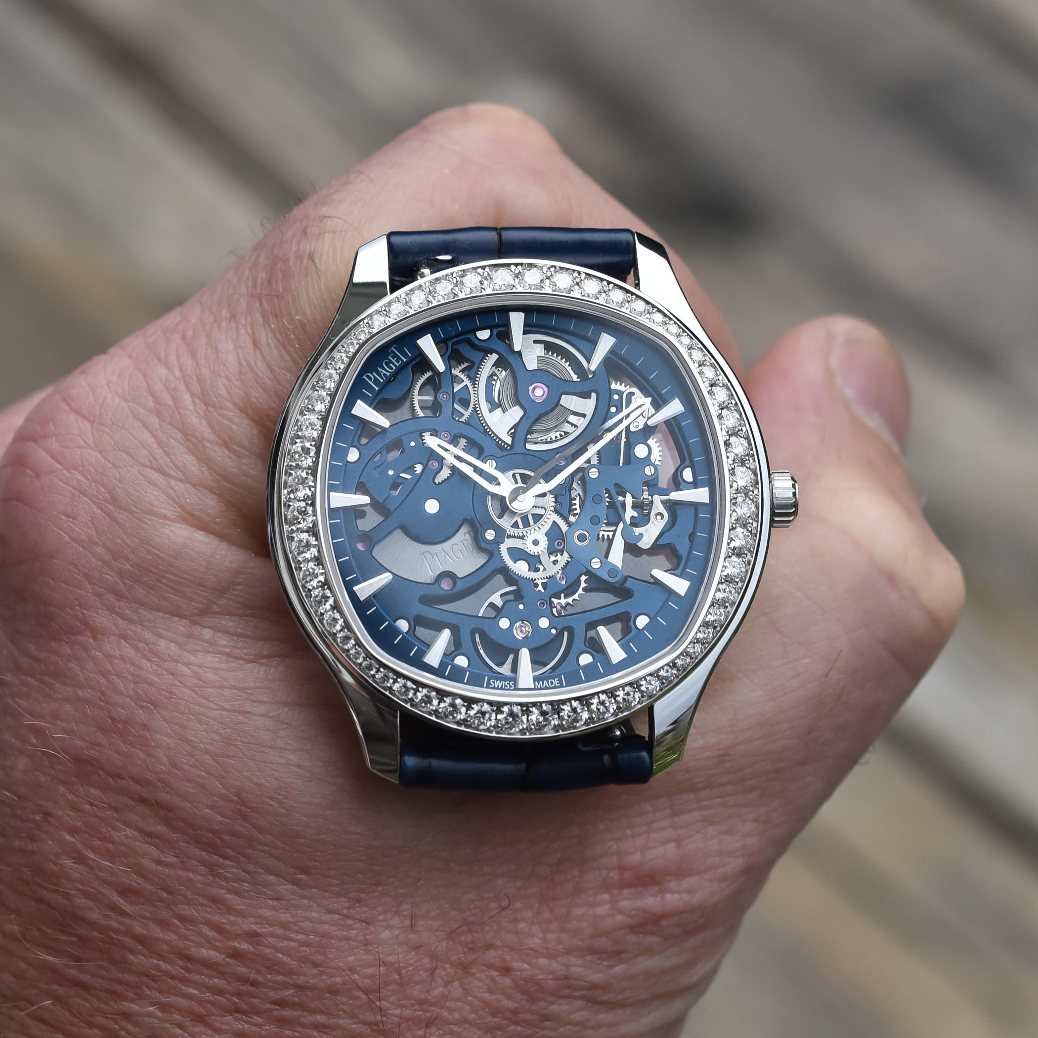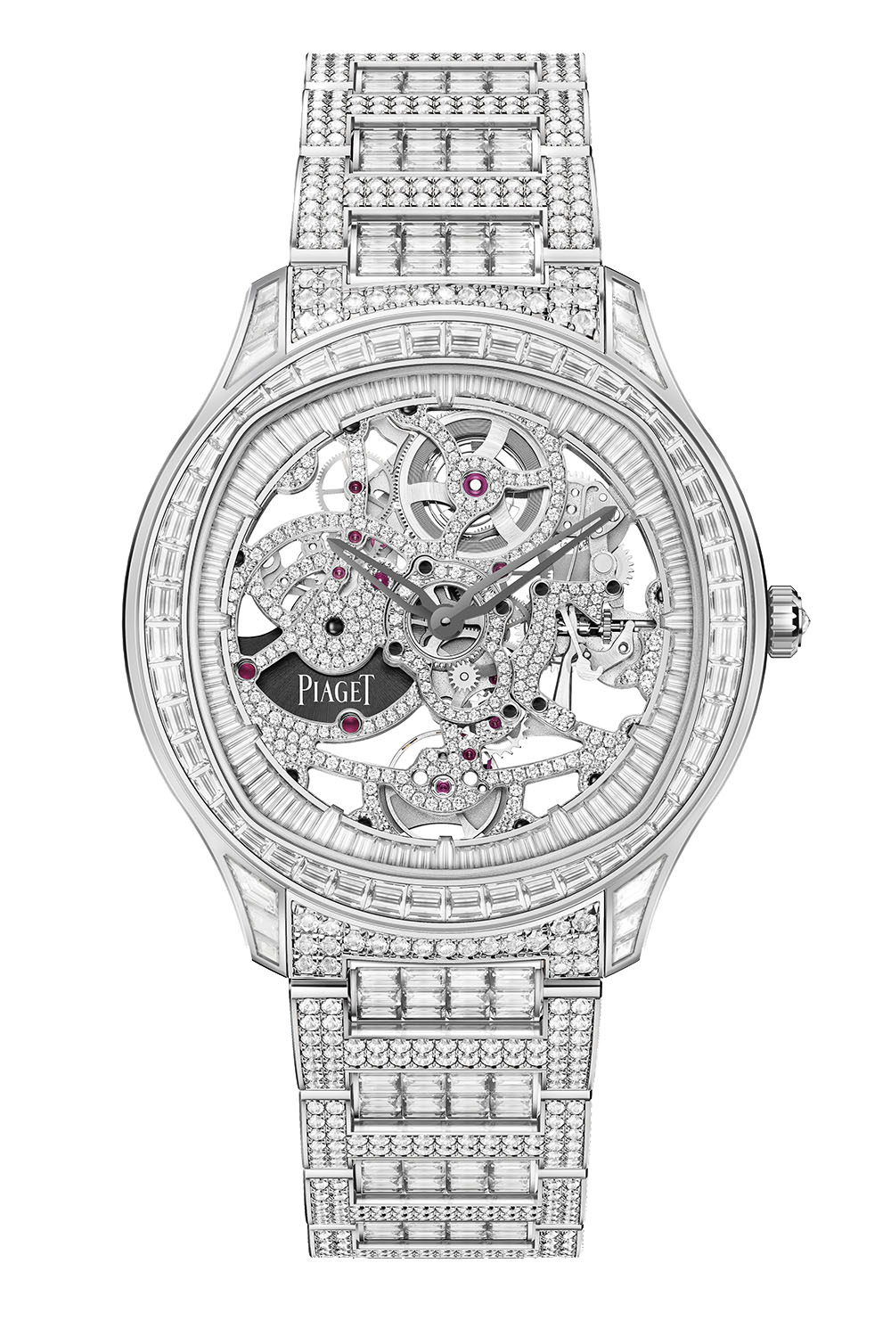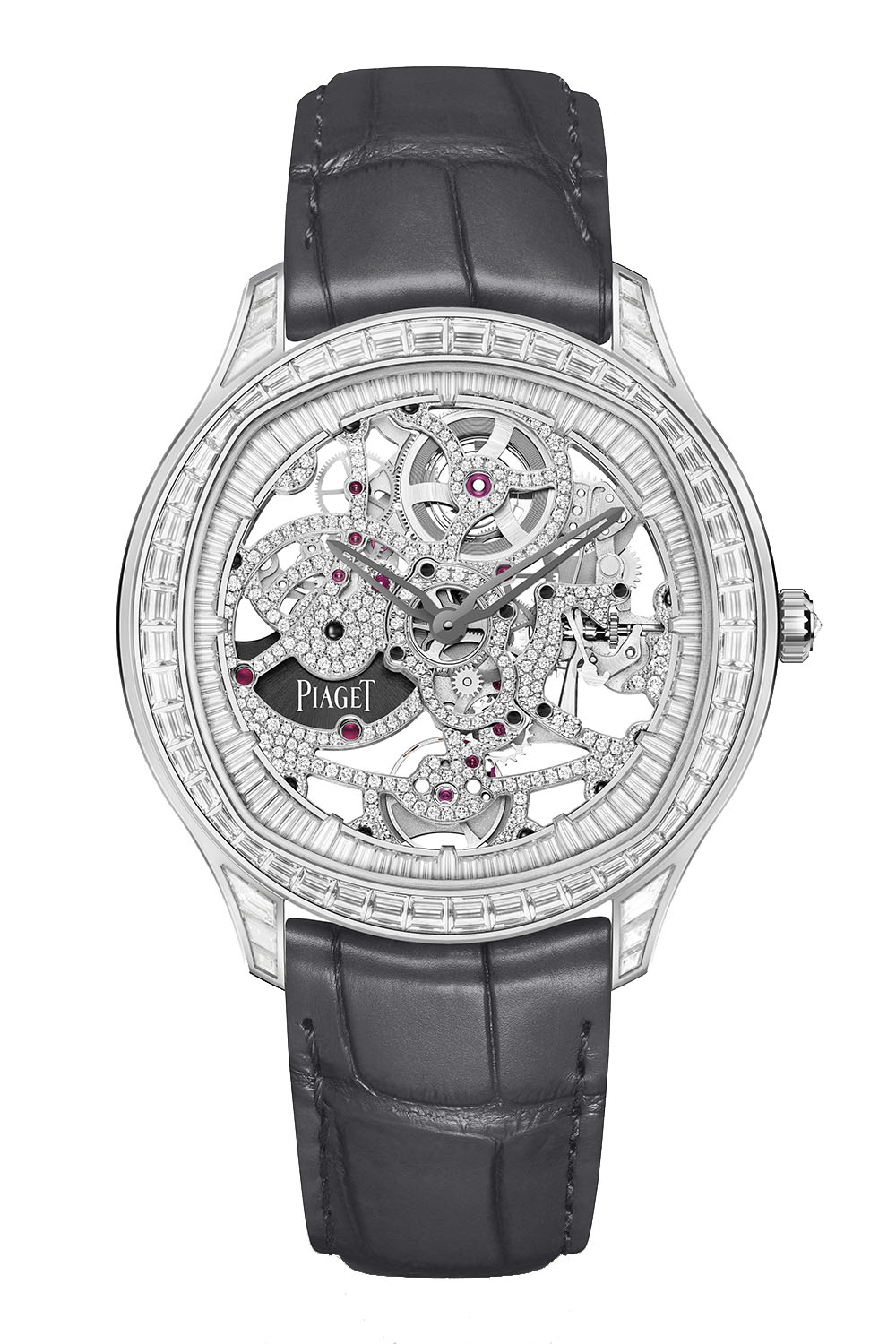 Piaget being Piaget, the Polo Skeleton is now also offered in high-jewellery, fully paved versions. In this instance, the case is just 7.99mm thick and it is set with 148 brilliant-cut diamonds (0.69 ct) and 60 baguette-cut diamonds (approx. 2.70 cts), the crown set with1 rose-cut diamond (approx. 0.05 ct) and the flange set with 72 baguette-cut diamonds (approx. 3.24 cts). Combining remarkable watchmaking and jewellery expertise, the movement is the skeletonised Calibre Piaget 1200D1, which carries 292 brilliant-cut diamonds and 11 brilliant-cut sapphires.