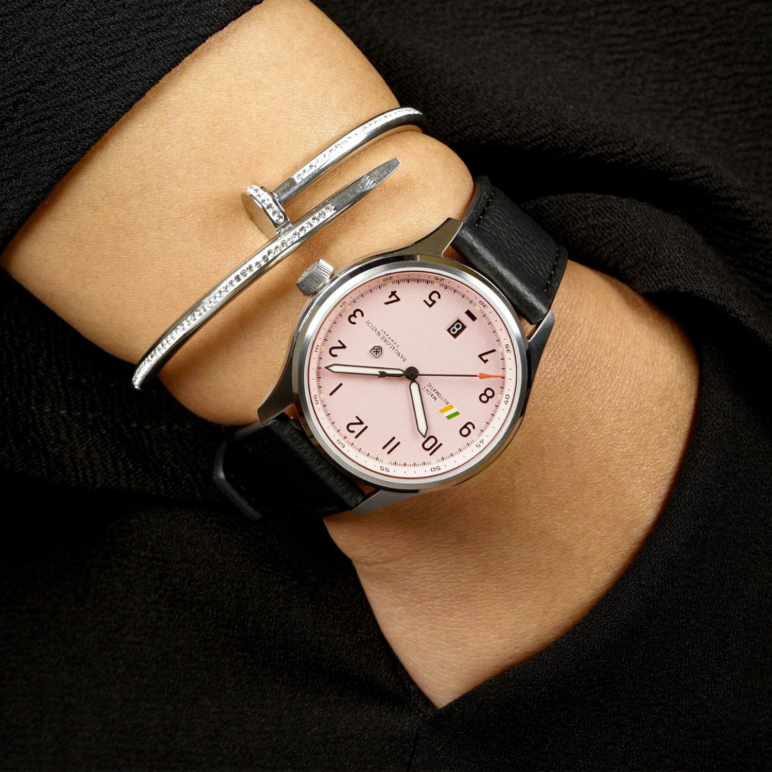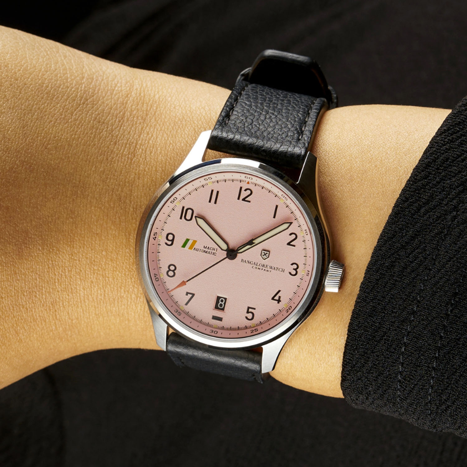Founded in 2018 by Nirupesh Joshi and his wife, Mercy Amalraj, the Bangalore Watch Company (BWC) proudly flies the Indian flag with watches promoting Indian aviation, cricket and even India’s influential space programme. The MACH 1 is the BWC’s collection of modern pilot watches inspired by and often made from material retrieved from fighter jets and carrier planes of the Indian Air Force. The latest model, which celebrates Indian women in aviation, is the MACH 1 Silk Scarf, a 40mm unisex model with a light pink dial.
