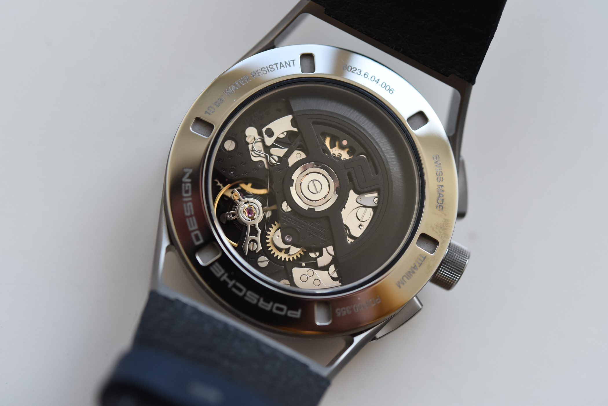 For many years, Porsche Design watches were equipped with ETA Valjoux movements or Lemania calibres. For instance, the previous 1919 Chronotimer watches, like this one, relied on third-party movements – the Sellita SW-500 to be precise. In 2017 though, the brand decided to up its game and to introduce a new movement, the “GT3 version” of the automatic chronograph if you like… sharper, more precise, with better performance and more functionalities.