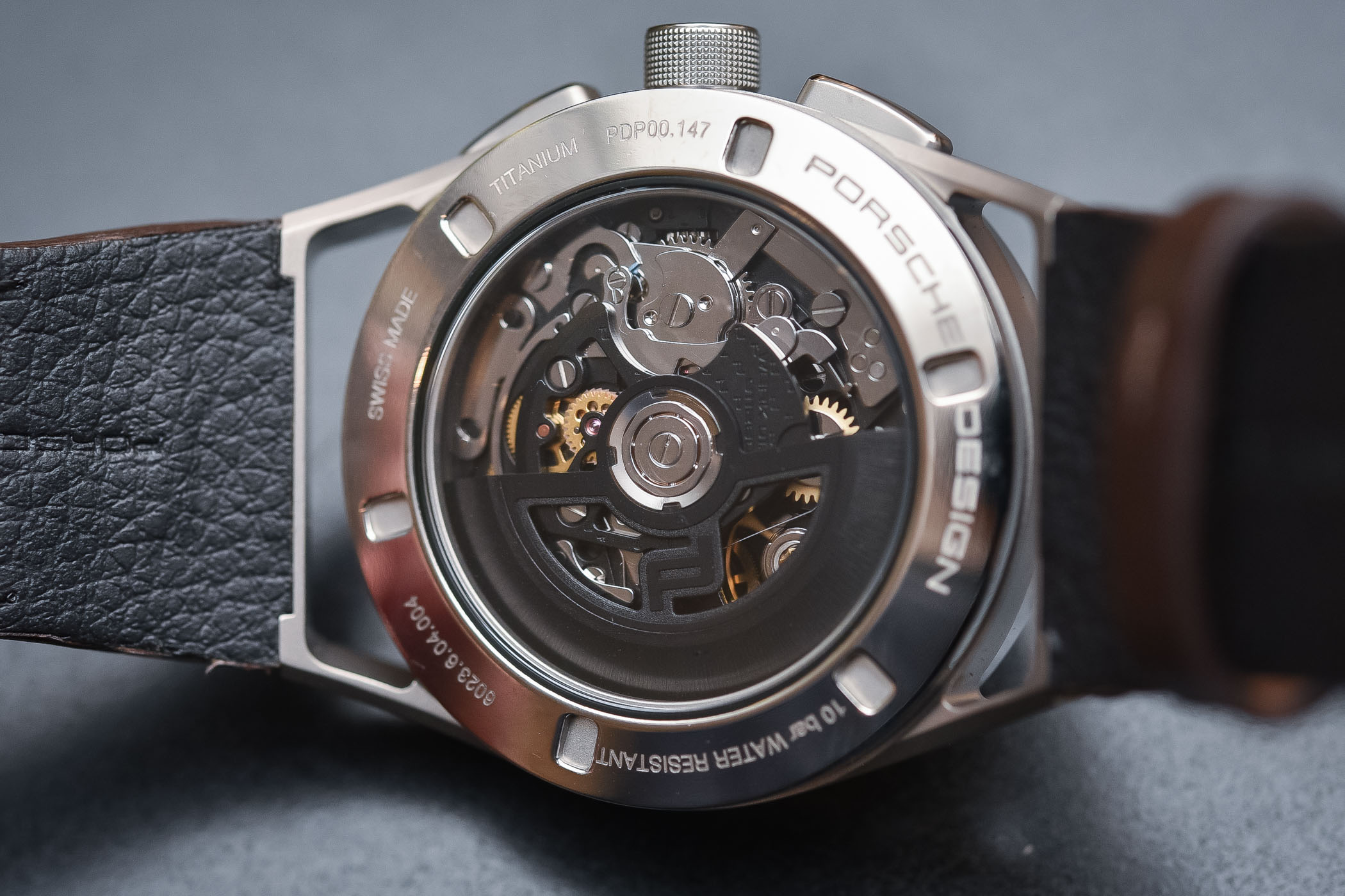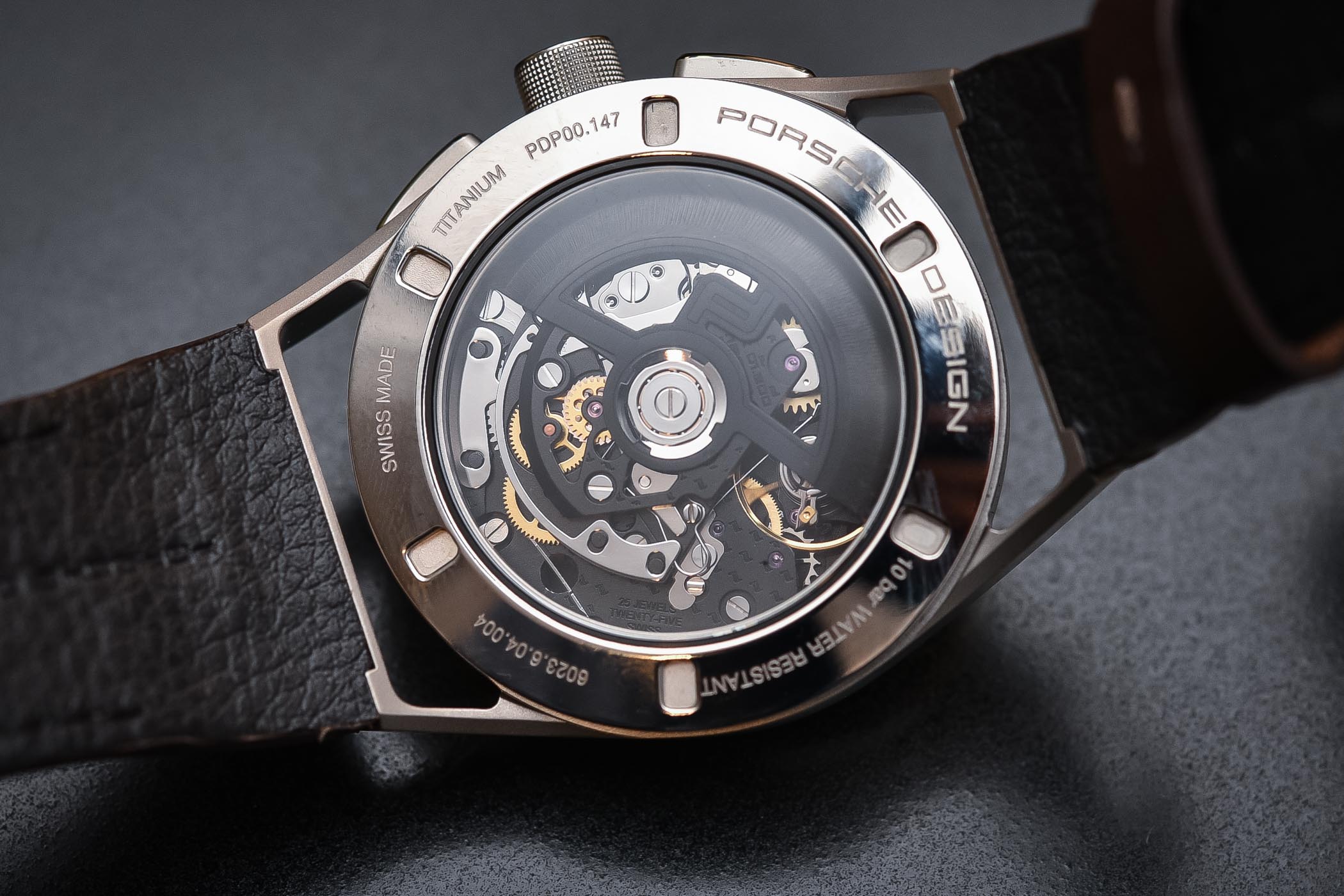 Mechanically, this Porsche Design 1919 Chronotimer Flyback Brown is different to the previous 1919 Chronotimers we’ve covered and reviewed. Those watches relied on third-party movements like the Sellita SW-500 inside the Porsche Design 1919 Chronotimer introduced in 2016. This Porsche Design 1919 Chronotimer Flyback Brown houses the specifically designed and developed Werk 01-200 movement (a so-called proprietary movement), which has been three years in the making and saw the light of day in the Exclusive Series watches, to coincide with the launch of the new Porsche 911 GT2RS and 911 Turbo S. It operates within COSC specifications, and is, of course, a flyback chronograph – which means it can be reset while running. In regular chronographs you have to stop, reset and then re-start the movement, but not with a flyback. The Porsche Design calibre WERK 01-200 is explained in more detail in a previous article, which you can find here.