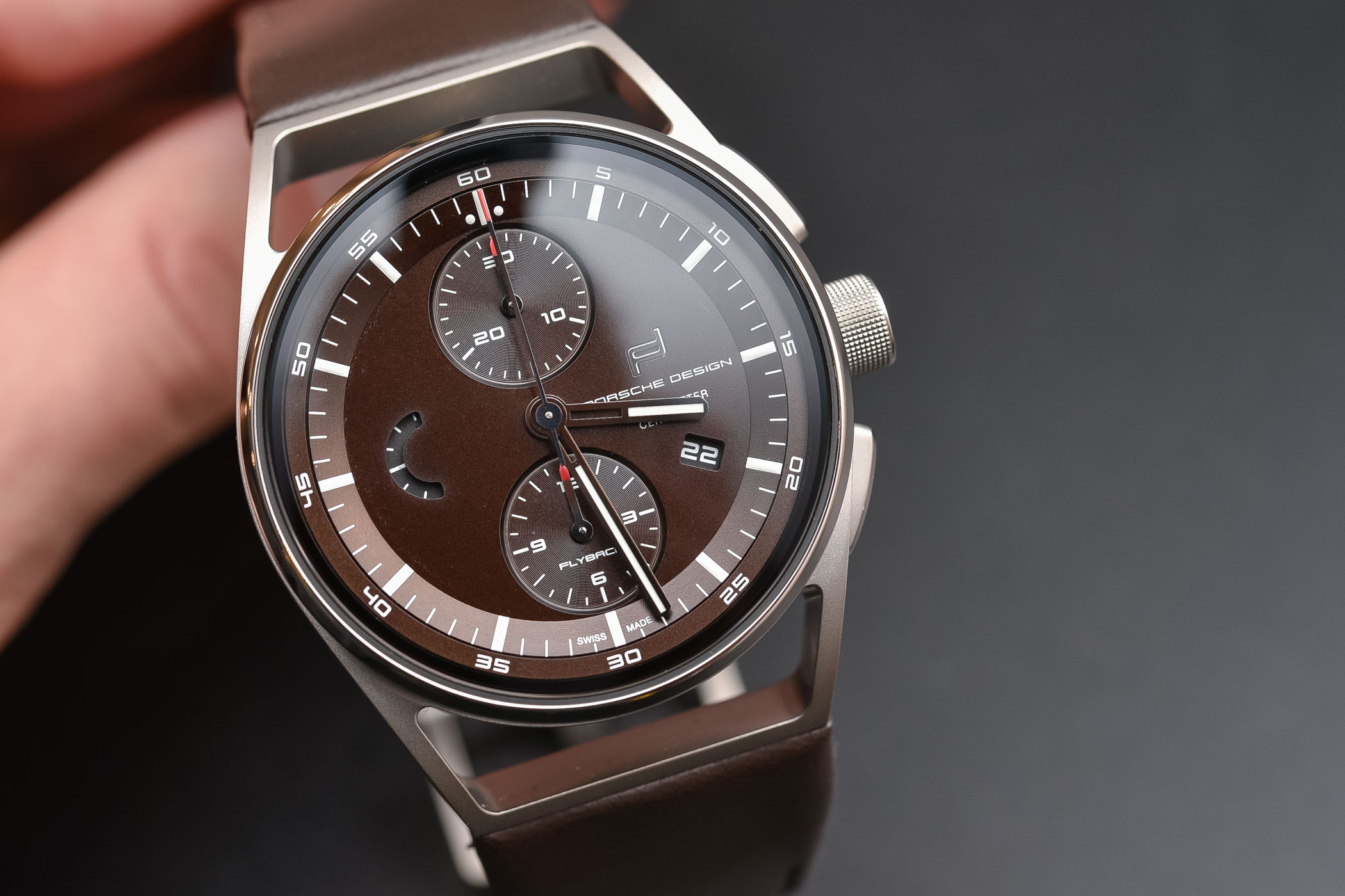 Since it’s conception, Porsche Design is about understated, sleek, ergonomic design and the watches, with the first ever “PD” introduced in 1972, follow suit. The 1919 collection features a case with a central container that includes the lugs. Well, not lugs in a traditional way, but smooth, straight extensions to the case on which the strap or bracelet is attached. The large knurled crown grips very well and is joined with two curved, elongated pushers that start at the strap-extension (lugs if you will) and gradually protrude more towards the crown. The pushers have been finished with a polished, bevelled edge giving the watch a bit of a dressier appeal. With this 1919 Chronotimer Flyback Brown, Porsche Design adds a new, warmer tone to the mostly monochromatic collection (either plain titanium or black DLC-coated titanium so far, both with black or blue dials).