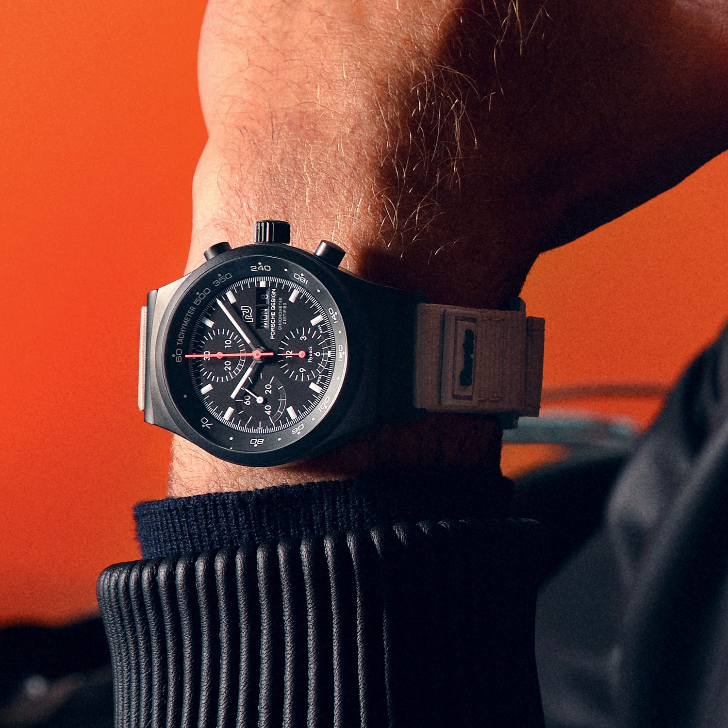 This emblematic 1972 model serves as a base for the creation of a limited edition celebrating the 911 Turbo, yet with modern tech in mind. The case, which retains most of the design cues of the vintage watch, measures 40.8mm in diameter and is made using ultra-light and durable titanium and finished with a scratch-resistant, black titanium carbide coating. Its simplistic, functional design has stood the test of time and remains one of the best racing chronographs of the brand. The case is completed by sapphire crystals on both sides, a screw-down crown and a comfortable 100m water-resistance.