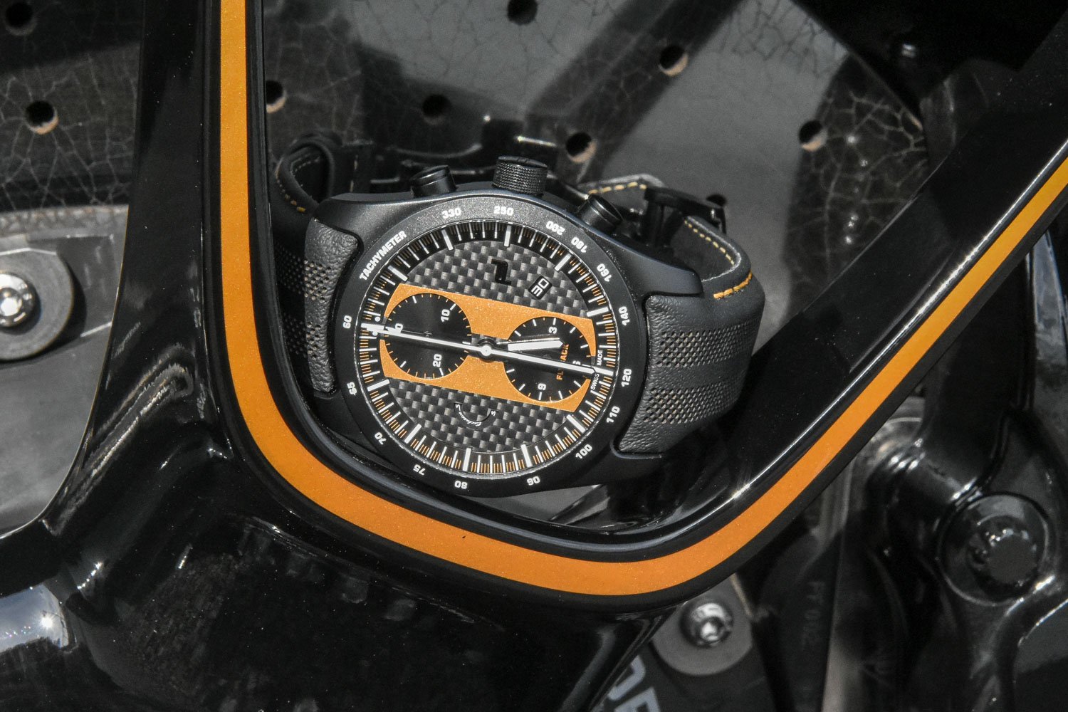 The dial is in carbon and comes with a striping in one of the six colour of the 911 Turbo S Exclusive Series (Golden Yellow Metallic, Carrera White Metallic, Agate Grey Metallic, Black, Guards Red and Graphite Blue Metallic) and will be done in original Porsche lacquer paint. The dial of the GT2 RS version is always in GT Silver Metallic, and is thus exclusive to this car. The hands (black for the GT2RS, and steel for the Turbo S version) have been applied with white Super-Luminova coating for maximum legibility. The chronograph hands are executed in steel on Turbo S version and in yellow on the GT2RS version.