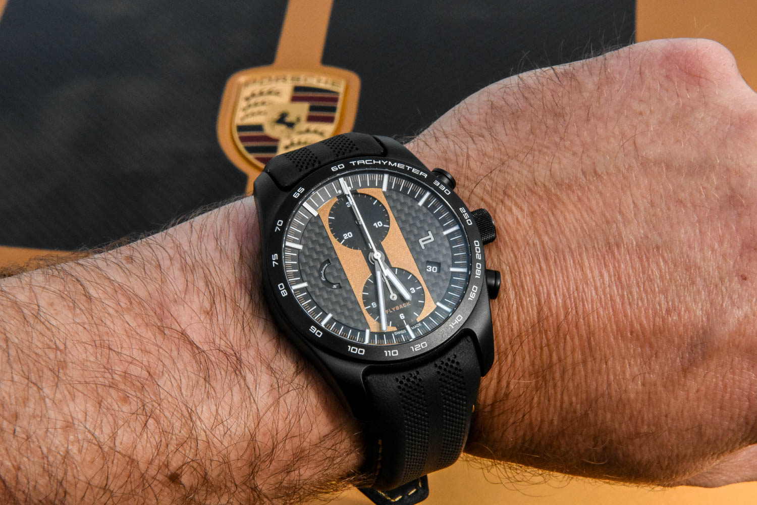 The movement is executed in matte black, and features brass gears, and the springs, levers, etc are in stainless steel. All that looks very befitting underneath the automatic winding rotor that resemble the magnesium 911 Turbo wheel rims.