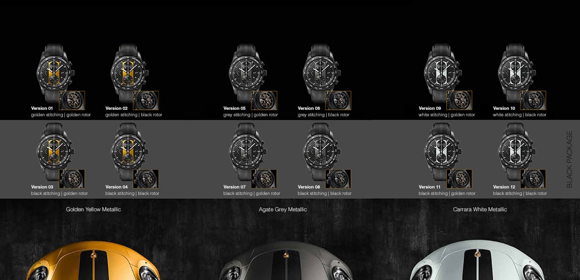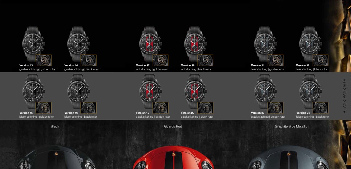 Indeed, the sub title mentions “strap and bracelet” because that is exactly what you’ll get when you buy the Chronograph 911 Turbo S Exclusive Series. A package with two leather straps and a black titanium carbide coated titanium bracelet. All three are equipped with a quick release system, so you can change from leather to titanium within seconds; the time needed for a (professional) pit stop. Here’s a taste of what you can choose from…