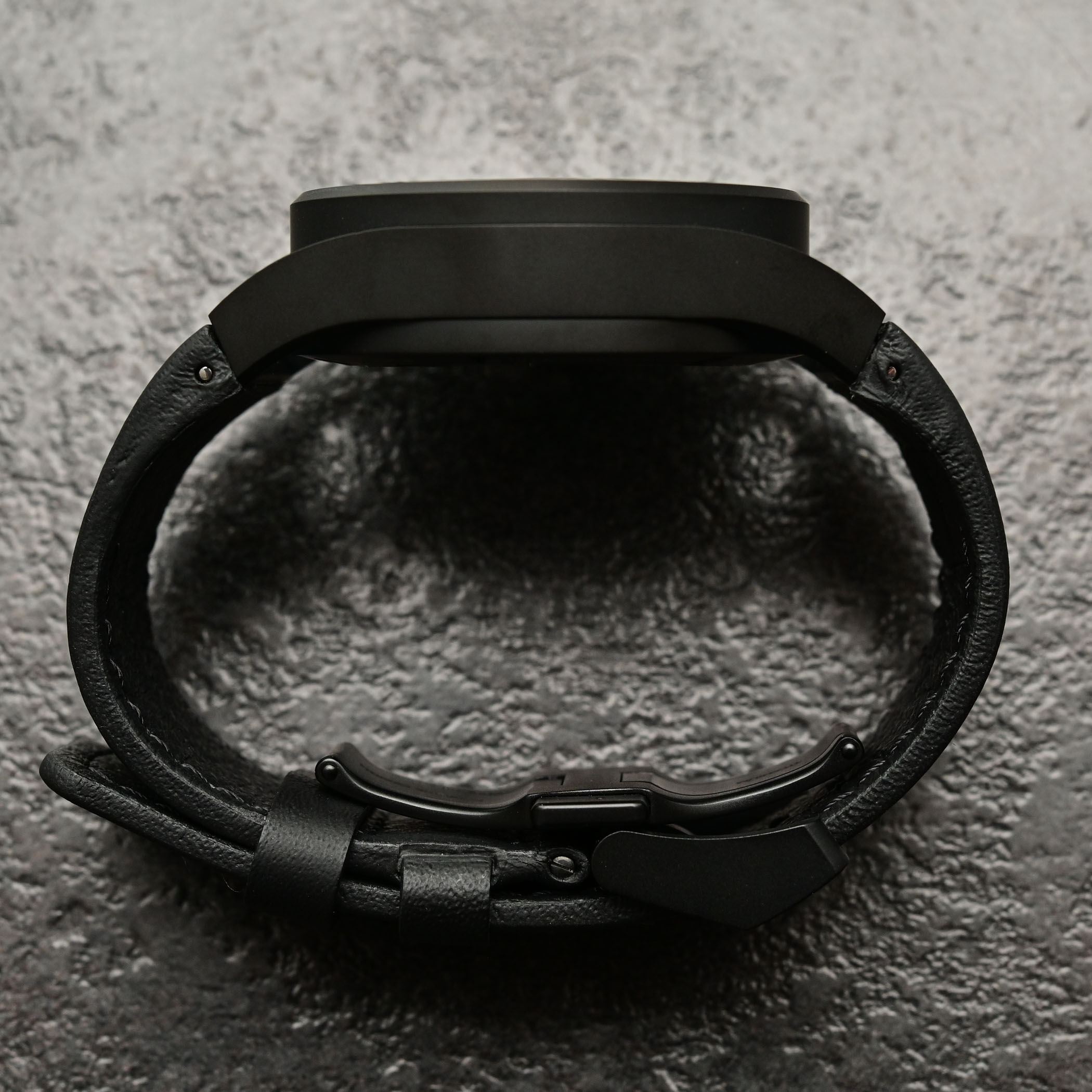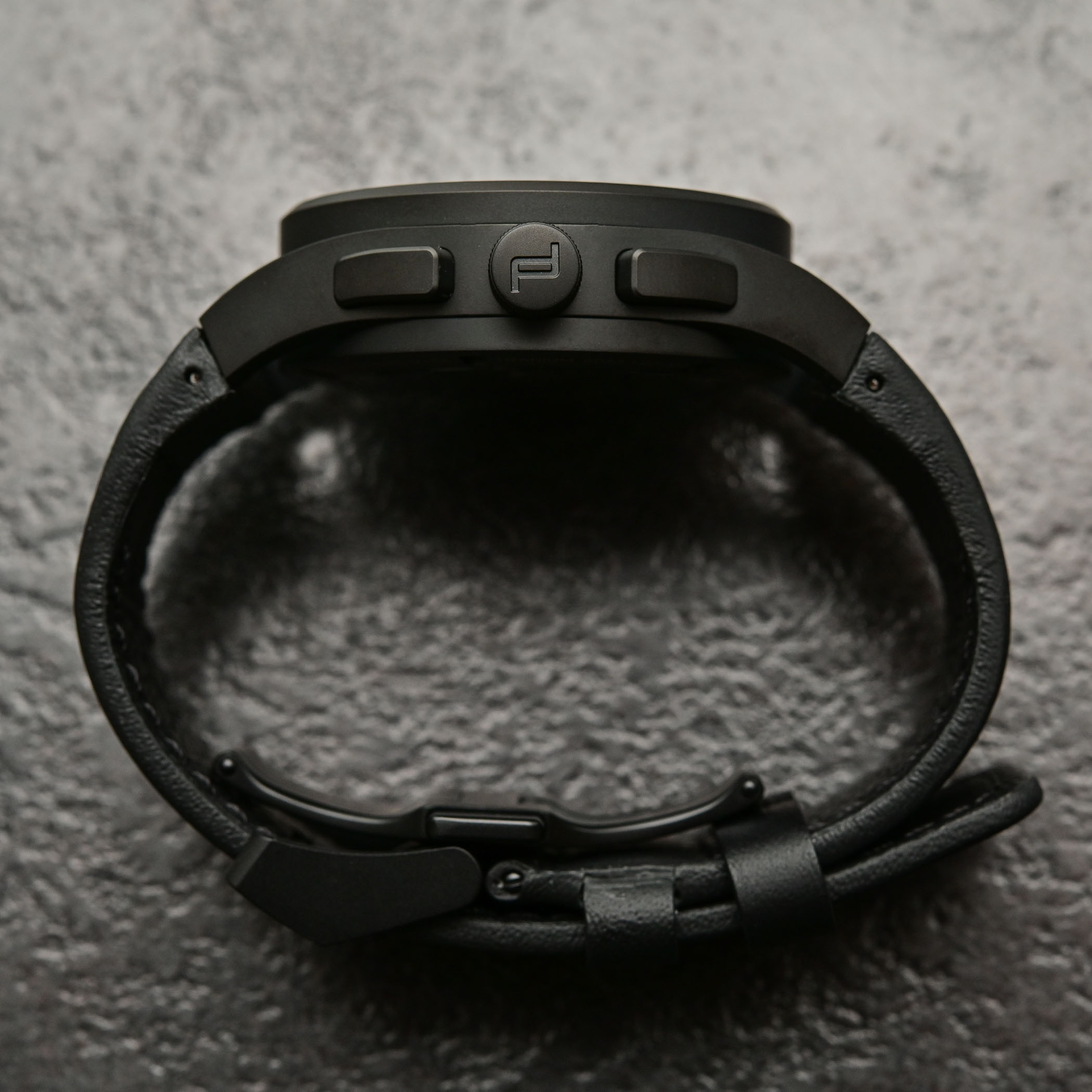 The Sports Chrono Automatic Chronograph is housed in a 42mm case with a 14.9mm height. In typical Porsche Design tradition, it is made of titanium, finished with a bead-blasted surface and coated with black carbide. Clearly, a stealth-looking watch. The signature open lug module is retained, contributing to the visual lightness and architectural look of the watch. It isn’t a compact watch per se and has presence on the wrist. However, this model needs to be tested, since its case is one of the most comfortable PD is producing.