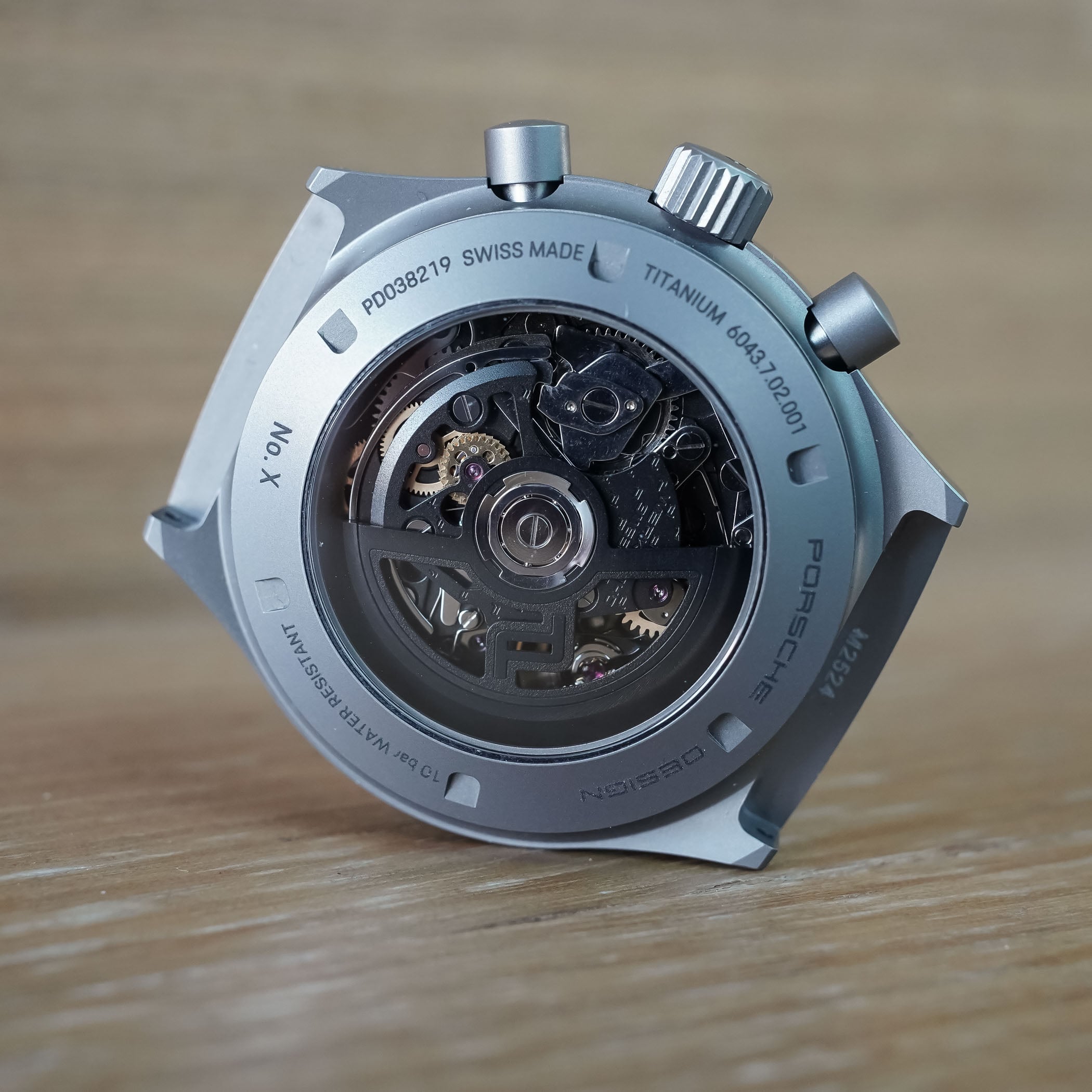 Porsche Design also uncovers its WERK 01.240 calibre by replacing the closed caseback with a sapphire crystal one. The flyback chronograph movement, running at a rate of 28,800vph and delivering a power reserve of 48 hours, is certified as a chronometer by COSC, which is always pleasant. The finishing is modern, with black PD-signed bridges and plates, and an openworked central rotor with the PD logo as its centrepiece. Contrat comes in the form of polished steel and gold-coloured components, and on the outside ring of the caseback, the laser-engravings reveal details such as the individual number, water resistance and so on.