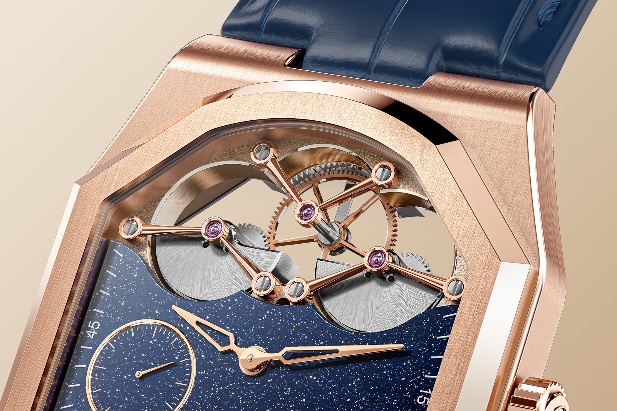 My initial inspiration was Daniel Roth with his typical watch shape. I didn’t want to copy and paste his design and wanted a sporty touch to it. This is when I draw the diagonals to make a more angular case. Regarding the movement, I wanted something elegant with the right mix of shapes, colours and textures. I’ve been inspired by so many brands that it would be difficult to give you one or two names.