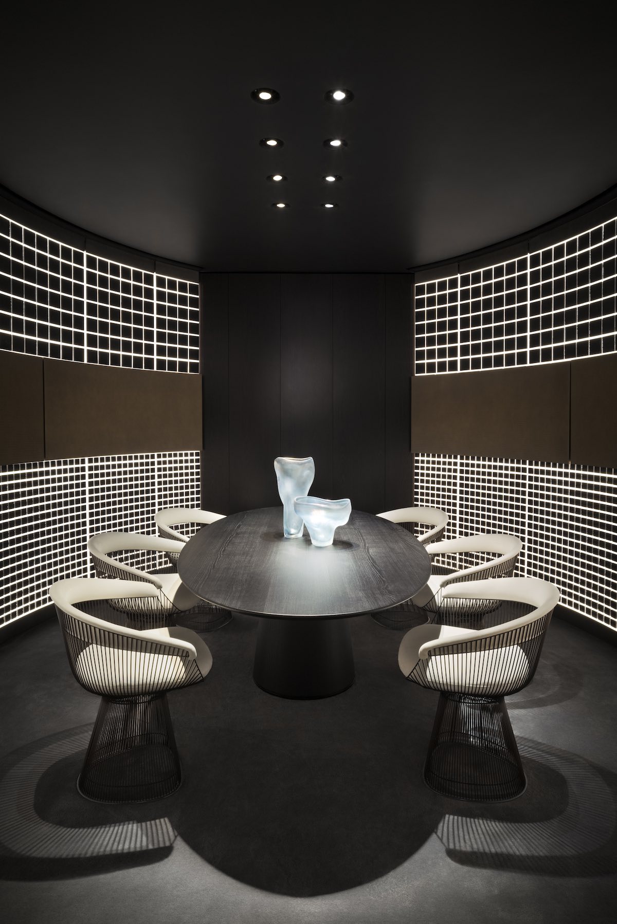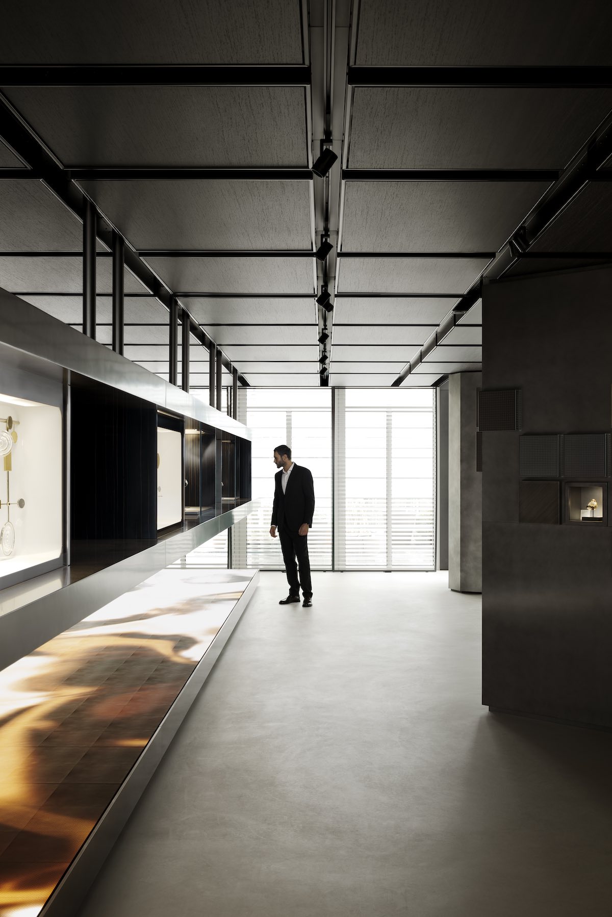 The house is indeed a mix of new retail and a luxurious home with an elegant mix of glass, wood panels and metal, as well as hidden cabinets and “quiet rooms” where deals are made and drinks are enjoyed in luxurious privacy.